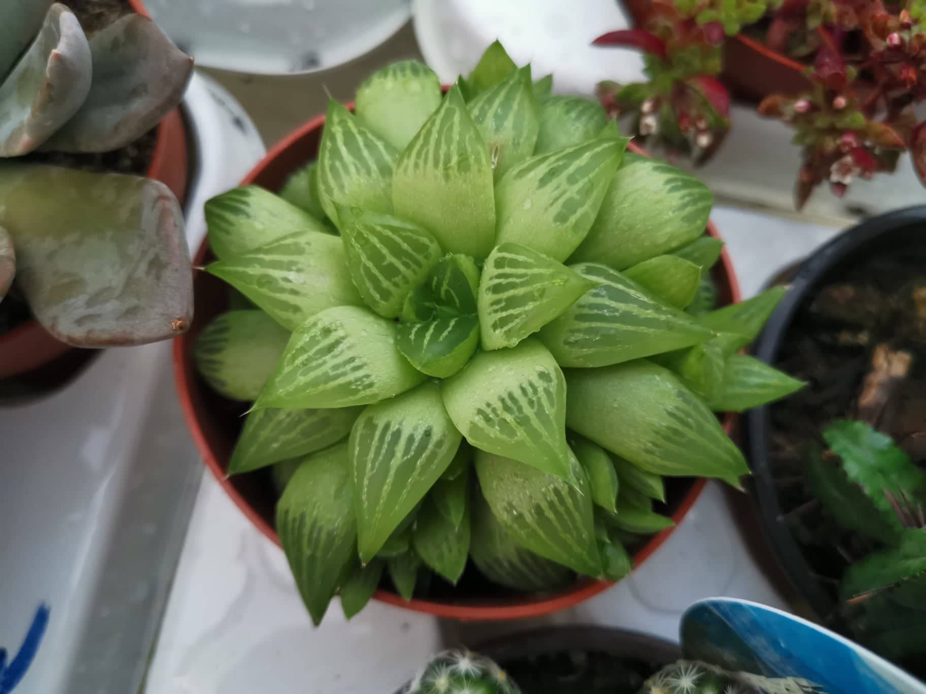 • Planta suculenta verde com folhas carnudas num vaso castanho rodeada por outras plantas