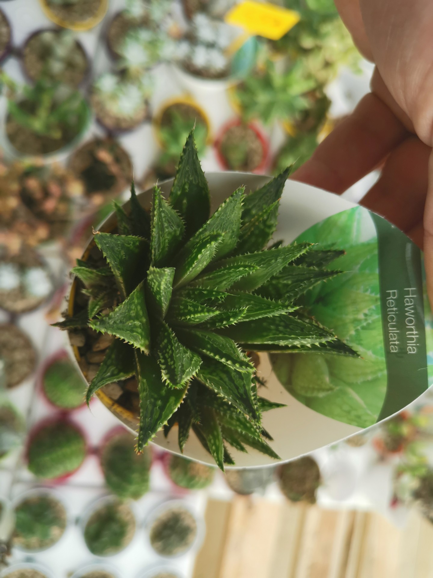 • Planta suculenta Haworthia Reticulata em vaso branco com fundo de outras plantas