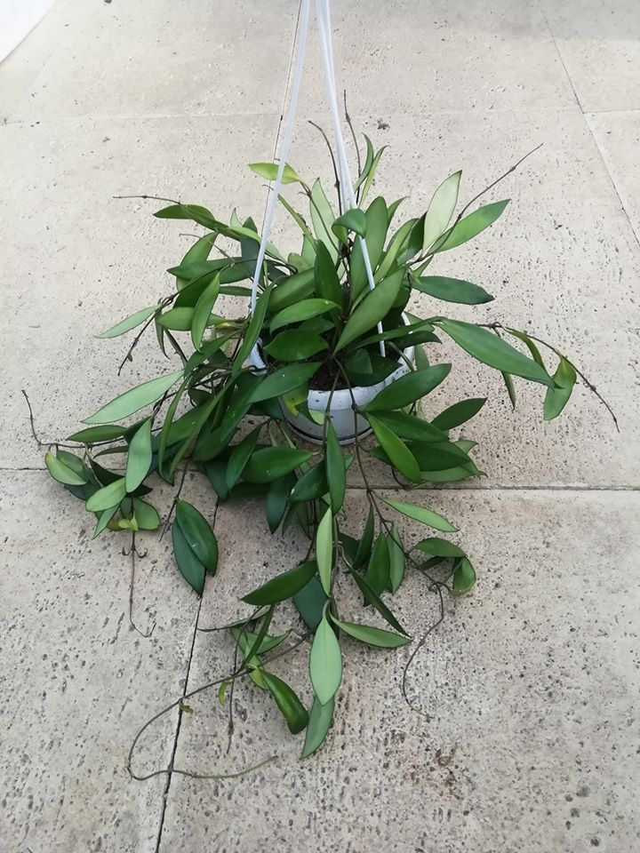 • Planta pendente em vaso branco suspenso com folhas verdes sobre chão de azulejos claros