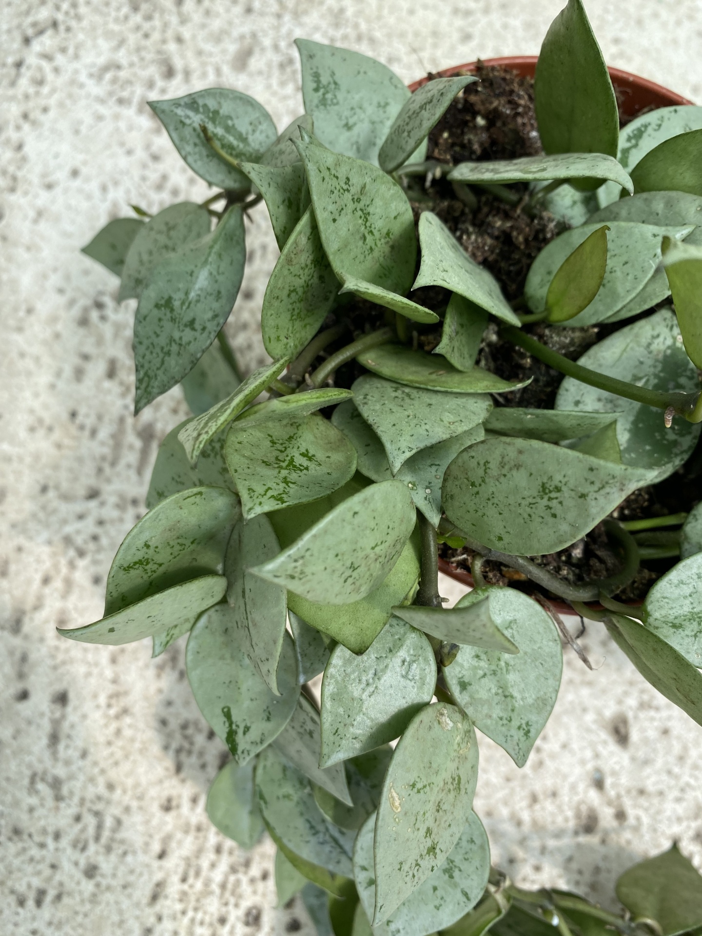 • Planta com folhas verdes claras e manchas escuras em vaso castanho sobre superfície branca rendilhada