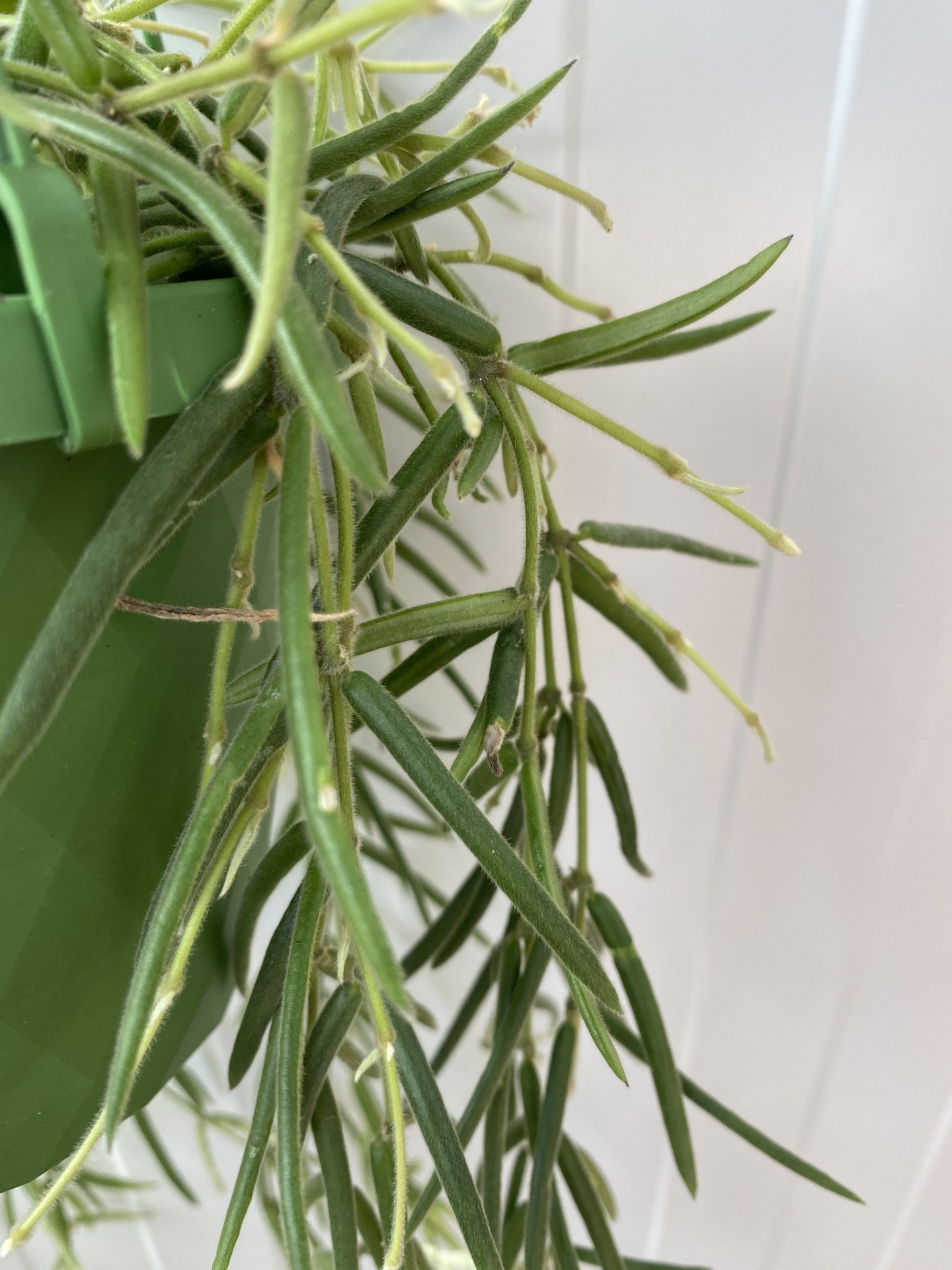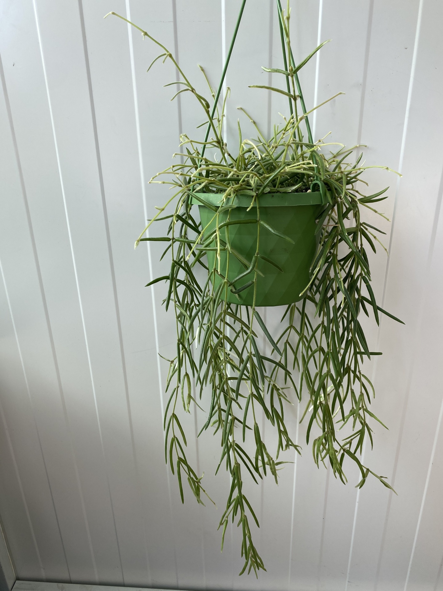 • Planta verde com folhas finas pendurada num vaso verde claro
