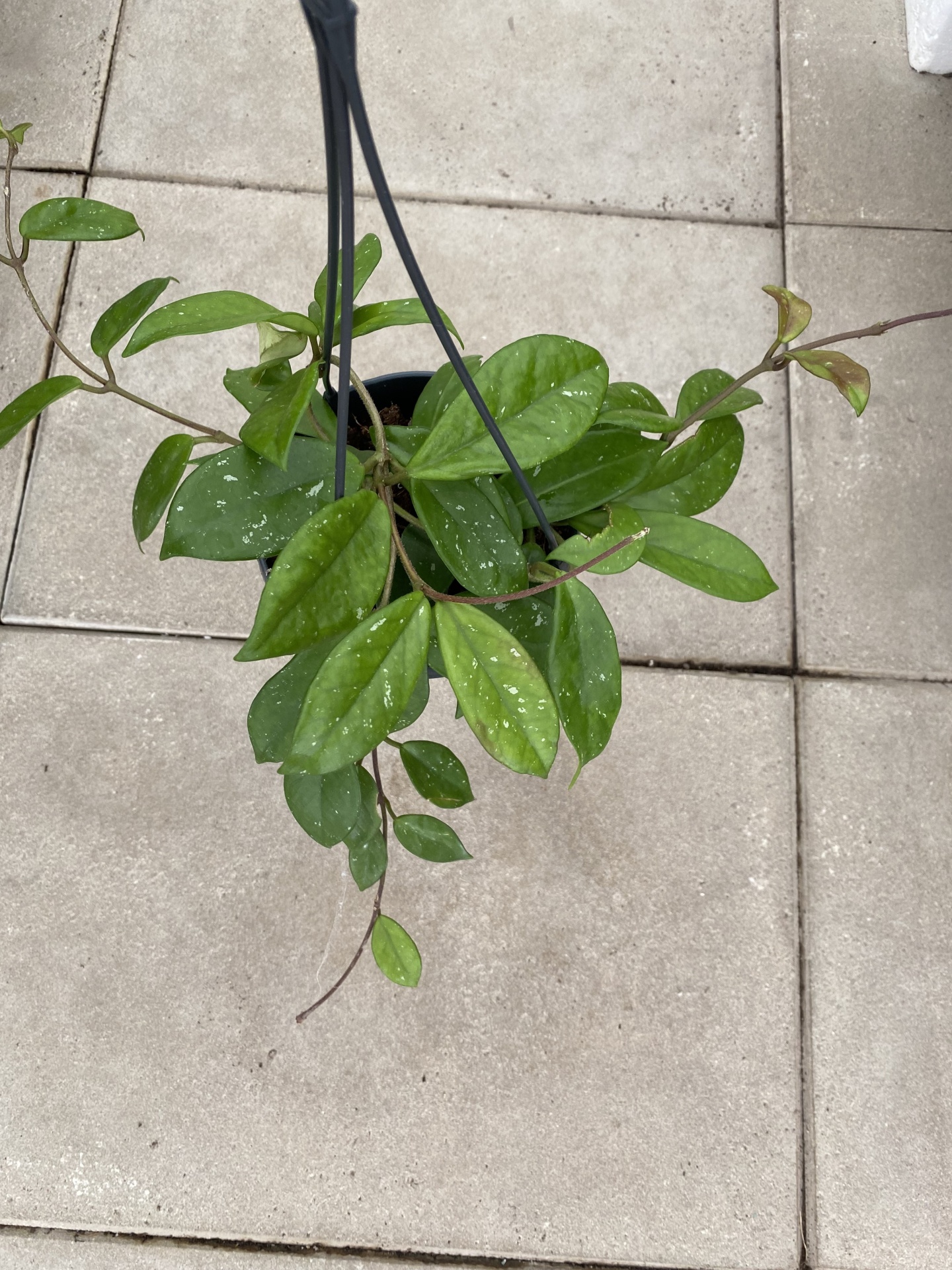 • Planta pendente com folhas verdes e manchas brancas em vaso preto