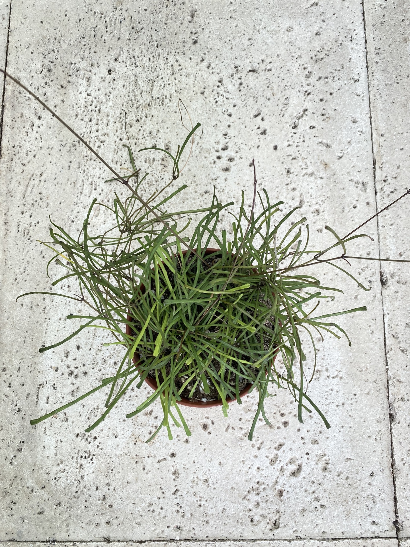 • Planta com folhas finas verdes em vaso castanho sobre chão de cimento claro.