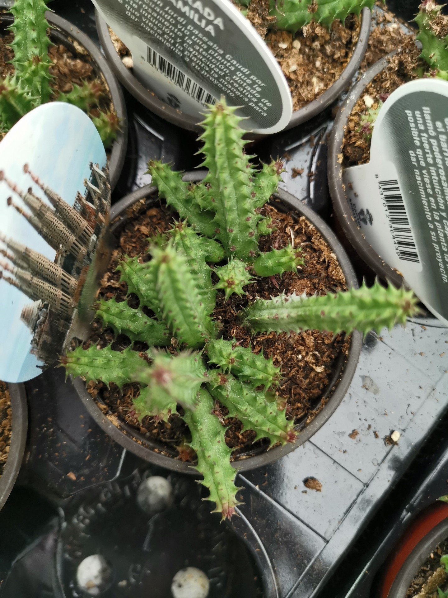 • Cacto em vaso pequeno com etiquetas e solo seco