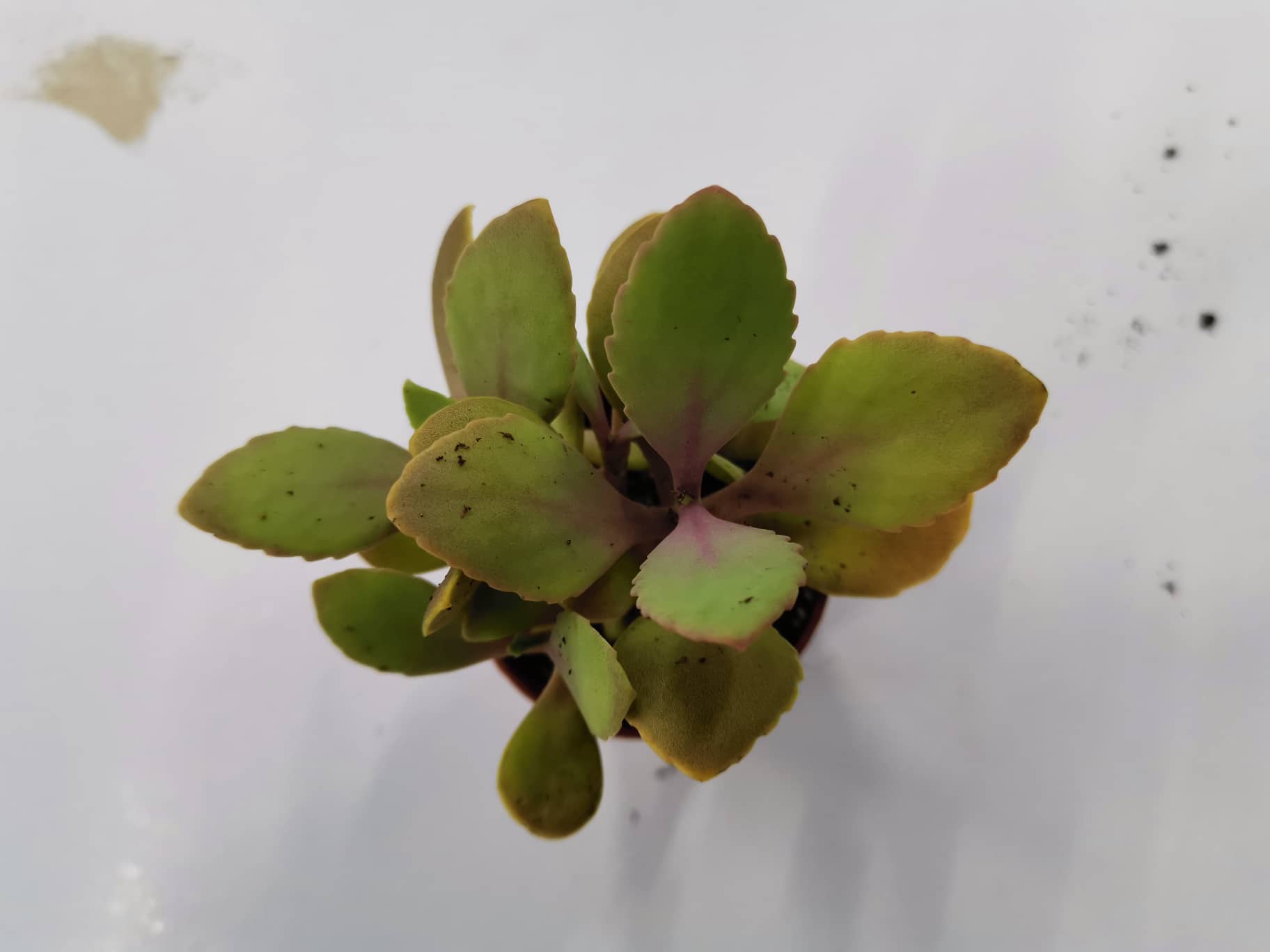 Planta suculenta em vaso preto com folhas verdes e bordas avermelhadas