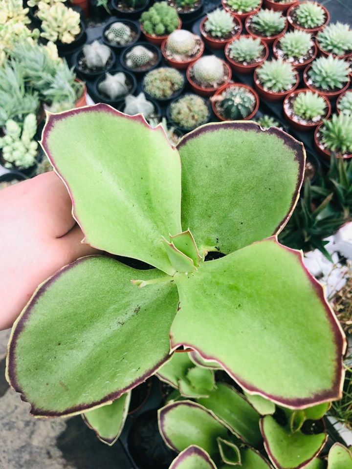• Planta suculenta com folhas verdes e bordas rosadas em vaso, com outras suculentas ao fundo