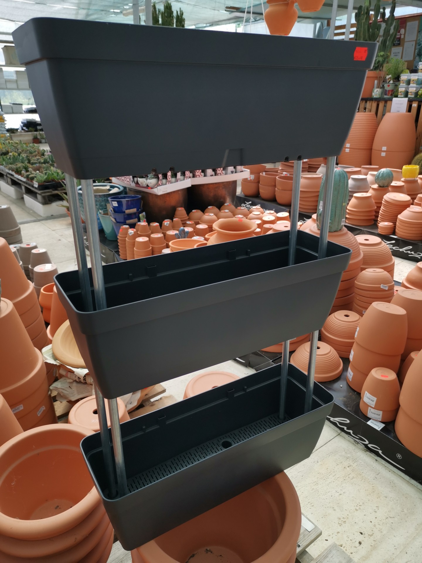 • Estrutura de vasos pretos empilhados com suporte metálico prateado e medidas indicadas