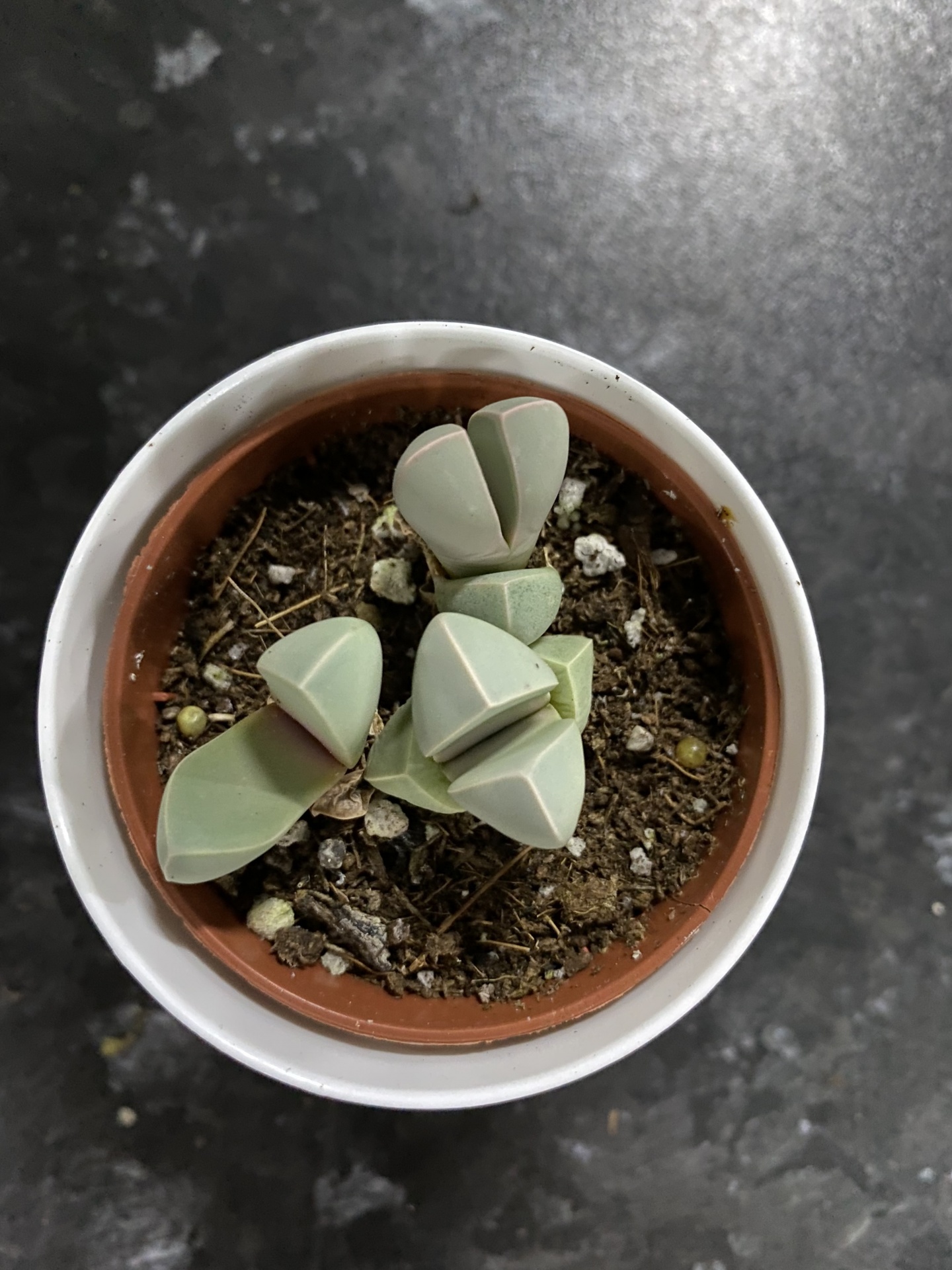 Planta suculenta Lithops em vaso sobre superfície cinzenta