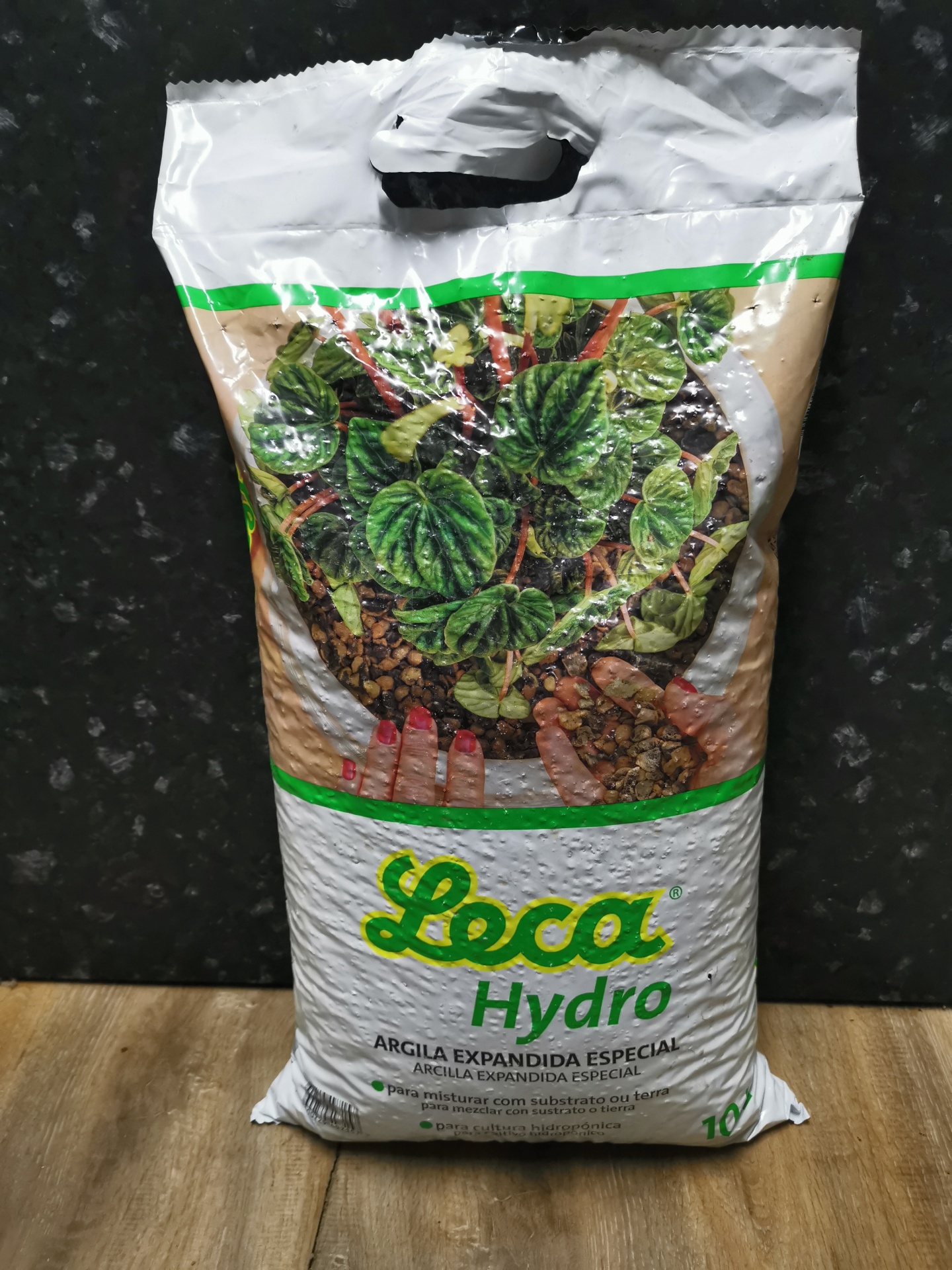• Saco branco de argila expandida especial Leca Hydro com imagem de planta verde