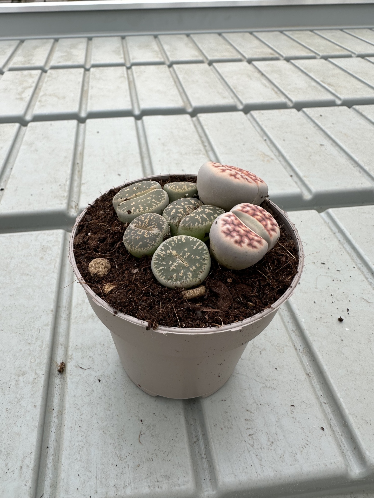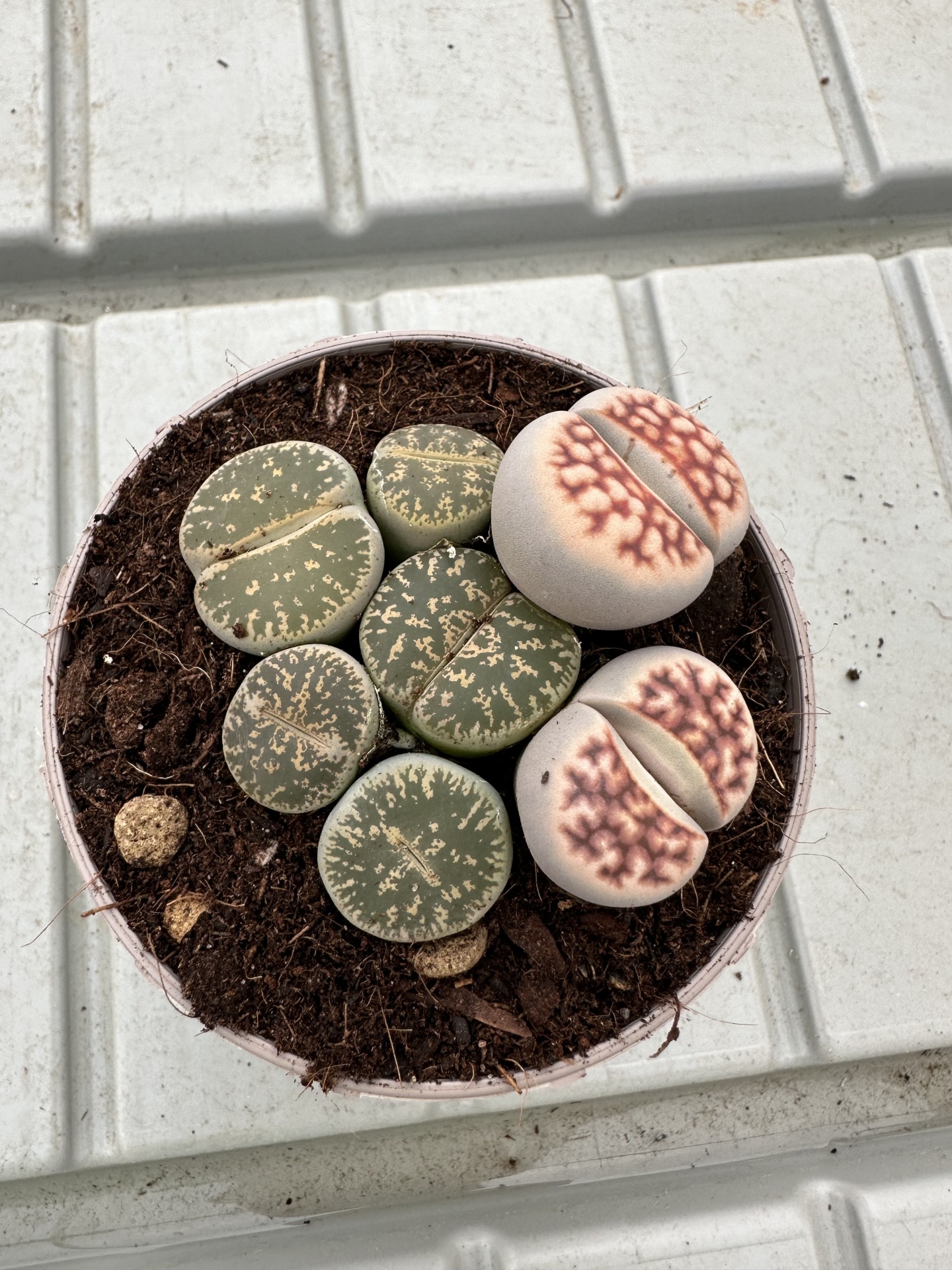 • Plantas suculentas Lithops em vaso circular numa superfície branca de plástico.
