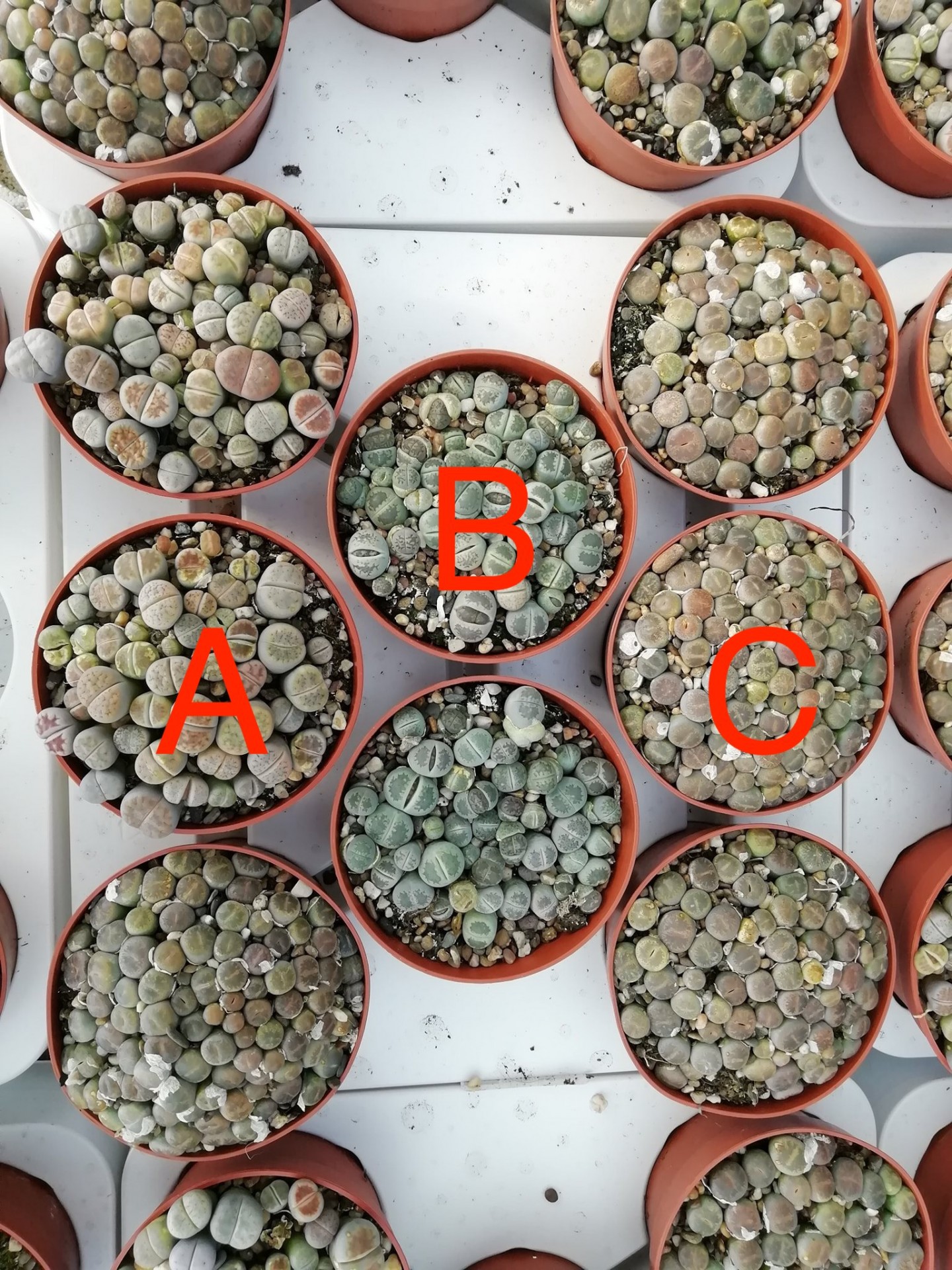 • Vasos com plantas suculentas Lithops com letras A, B e C