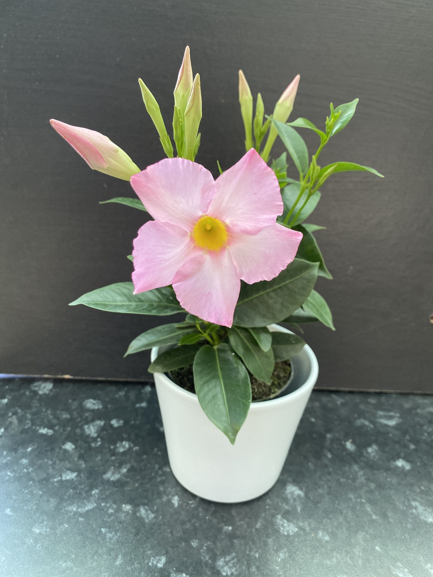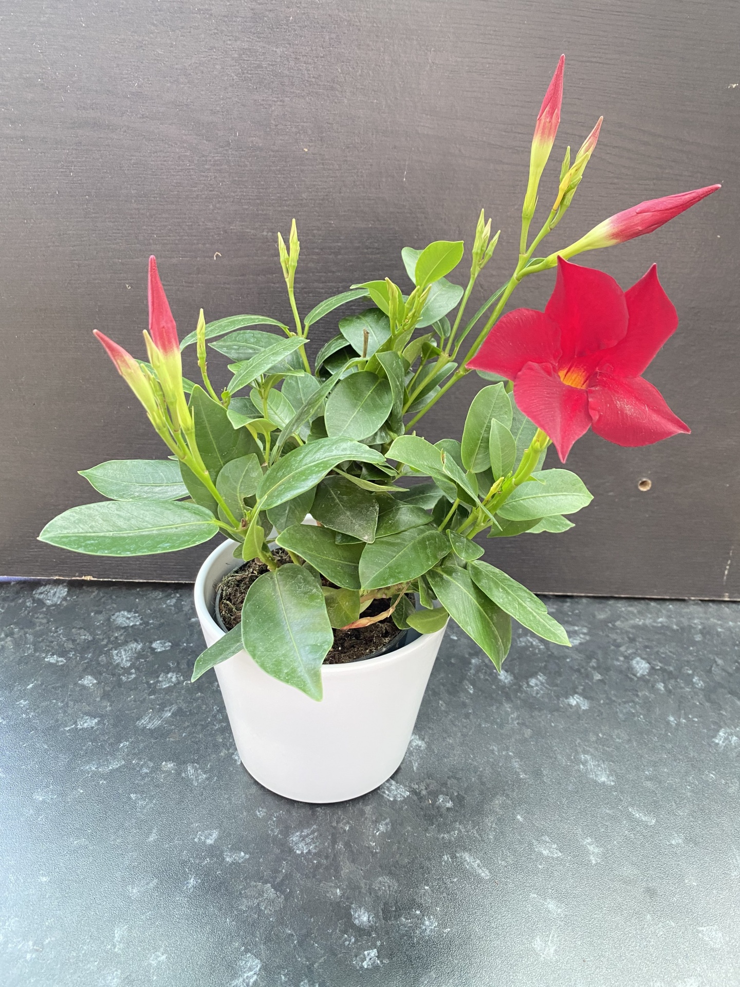 • Planta com flores vermelhas em vaso branco sobre superfície cinzenta
