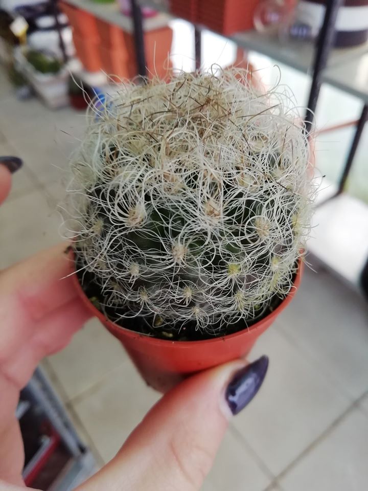• Cacto verde com espinhos brancos em vaso vermelho segurado por mão com unhas roxas