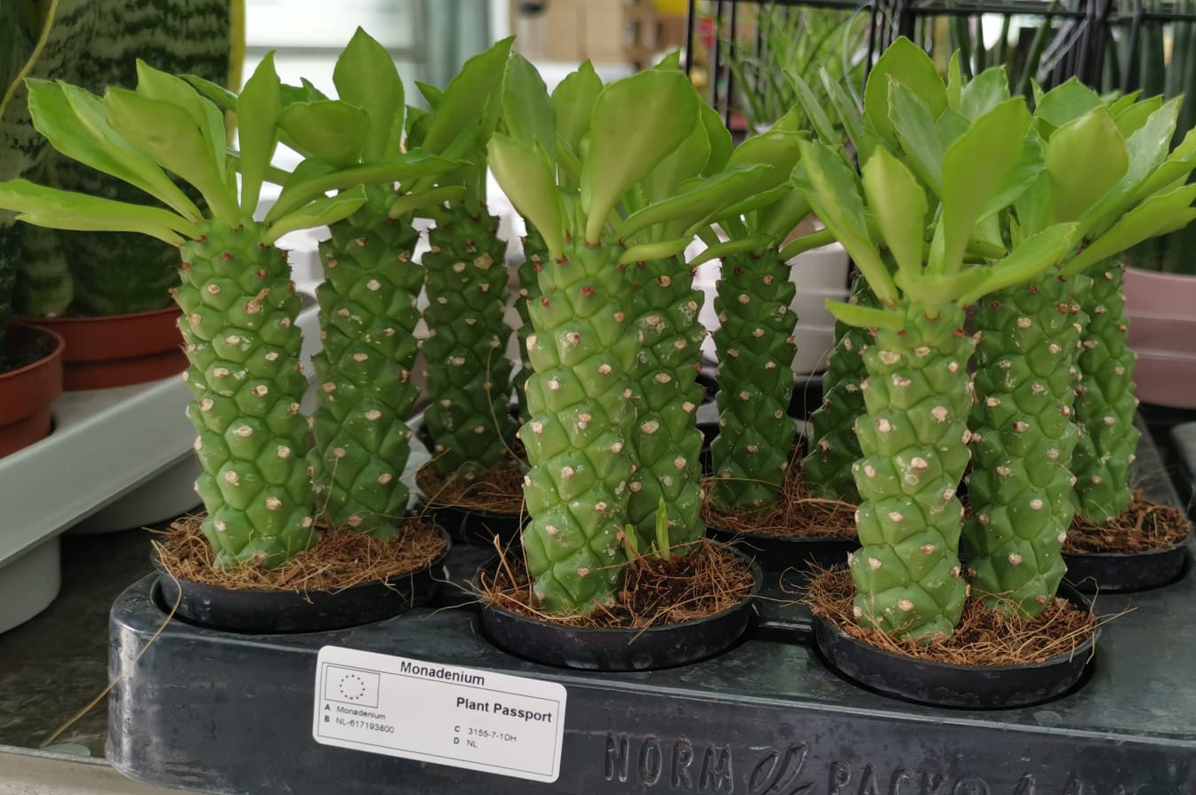 • Pequenas plantas suculentas verdes em vasos pretos, dispostas em bandejas num interior com outras plantas