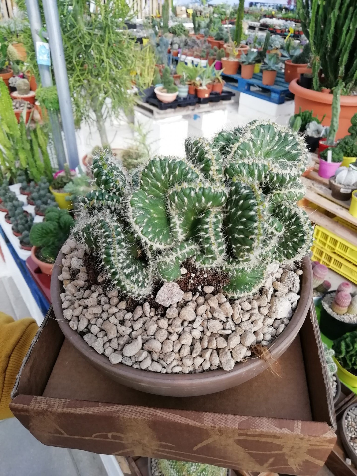 • Vaso castanho com cacto ondulado e pedras, em caixa de cartão, em estufa de plantas
