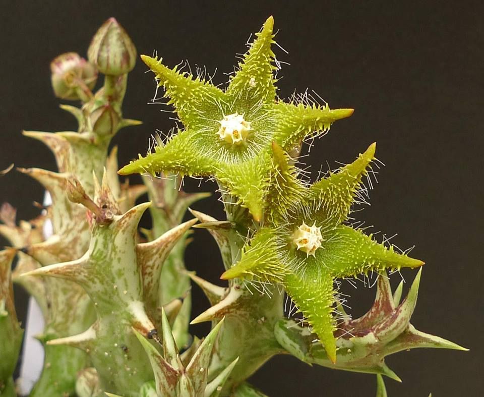 Flores verdes espinhosas em caules pontiagudos com fundo preto