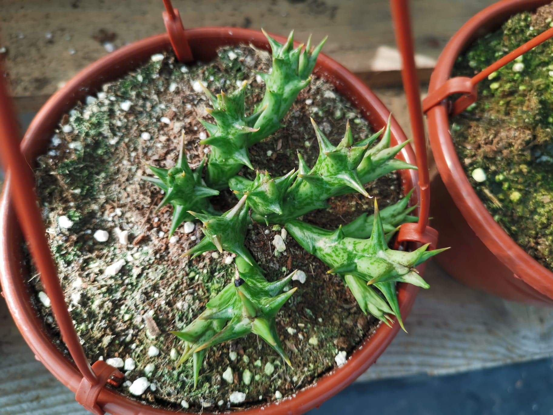 • Planta suculenta espinhosa em vaso de plástico vermelho