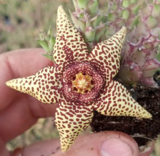 Flor com cinco pétalas manchadas castanho sobre creme em forma de estrela, segurada por mão humana