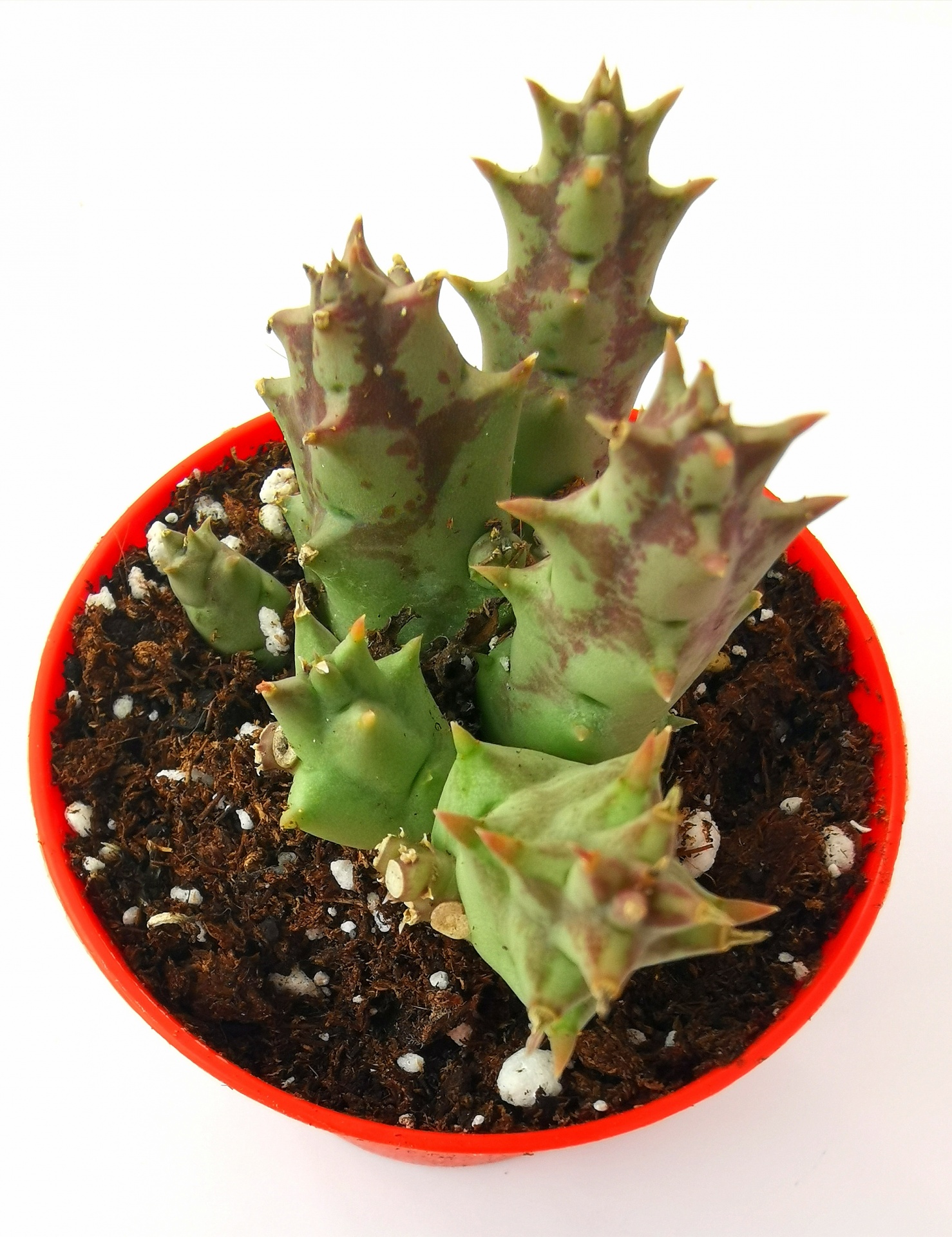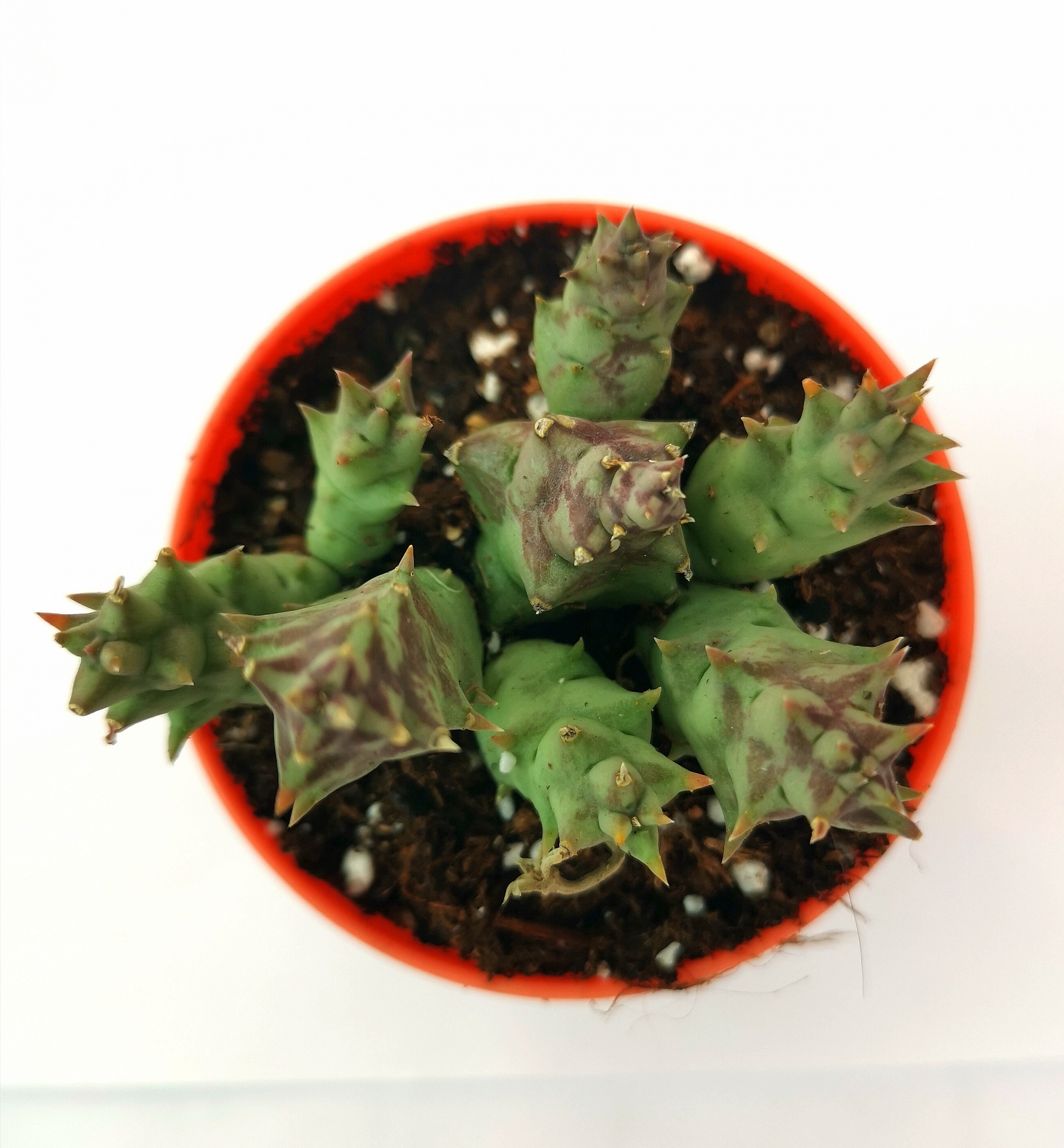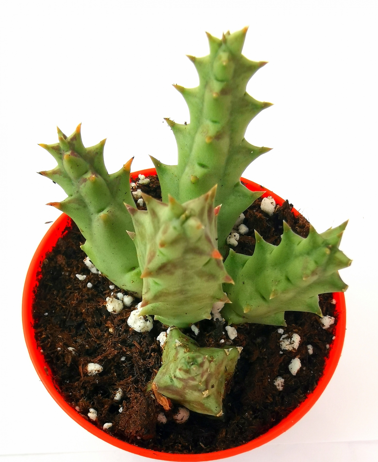 • Planta suculenta verde espinhosa em vaso vermelho com terra escura