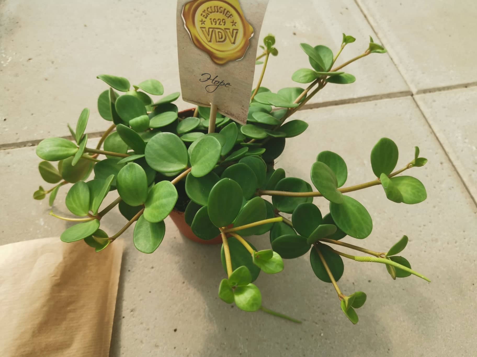 Planta suculenta verde em vaso com etiqueta identificativa sobre chão de azulejos.