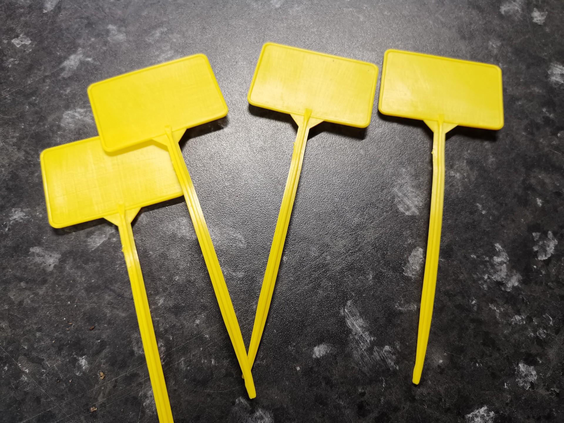Quatro etiquetas de plástico amarelas retangulares com cabos longos sobre superfície escura