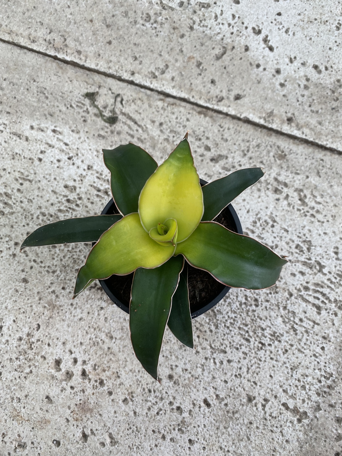 • Planta suculenta com folhas verdes e amarelas em vaso preto sobre piso de cimento