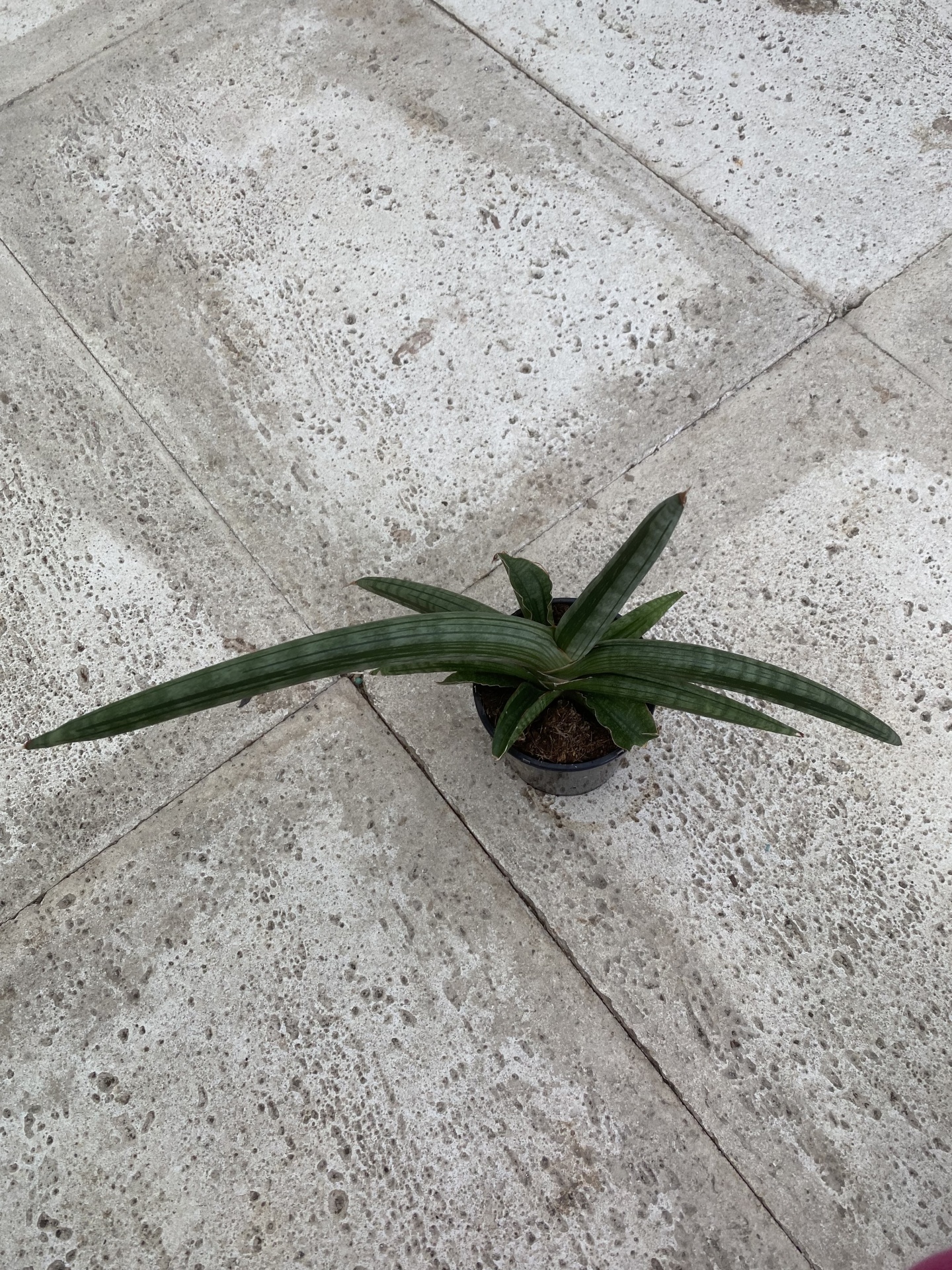 • Planta em vaso pequeno preto com folhas verdes longas e finas sobre chão cinza claro
