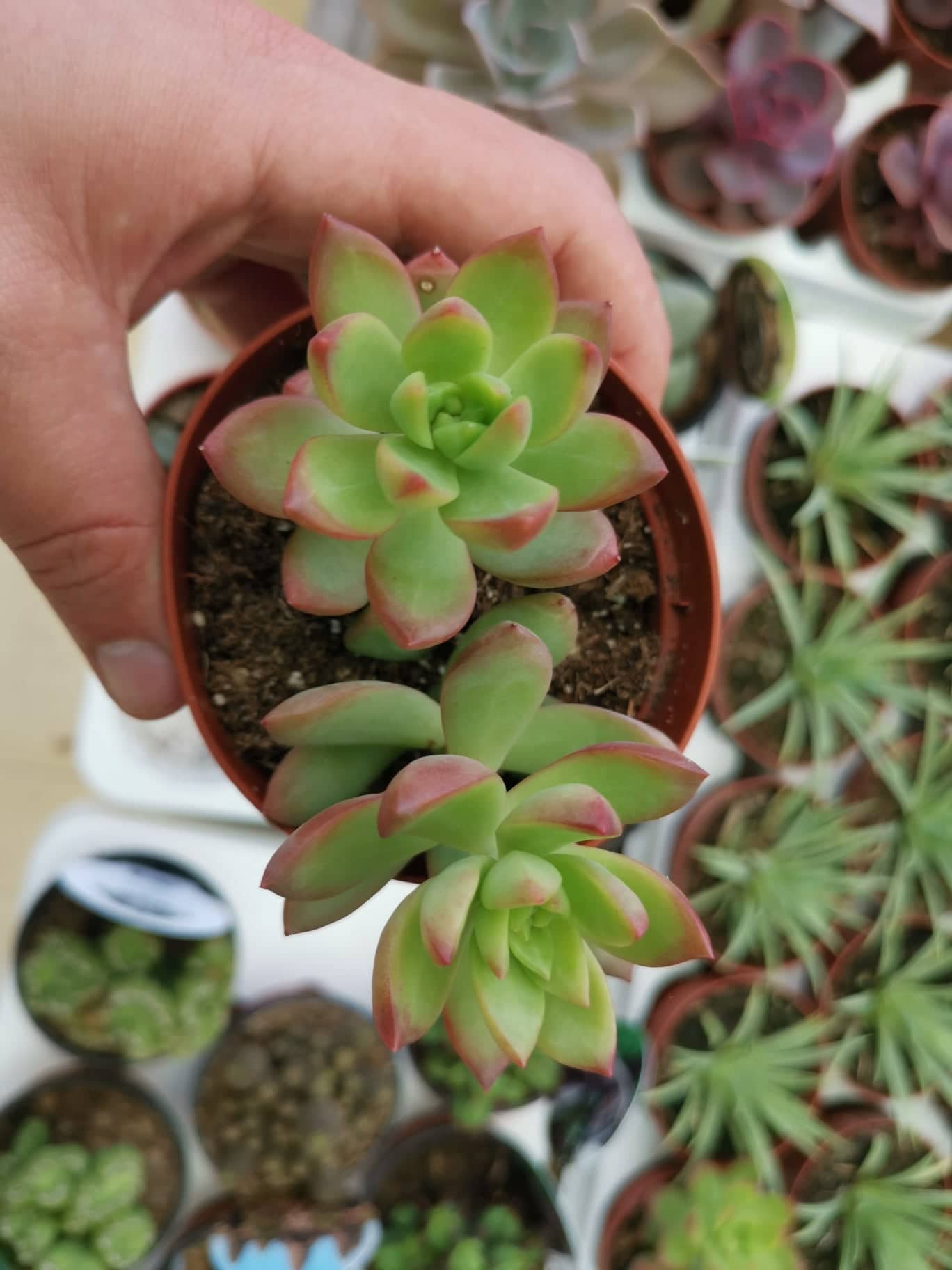 Planta suculenta em vaso castanho com folhas verdes e vermelhas, mãos a segurar, fundo com suculentas desfocadas.