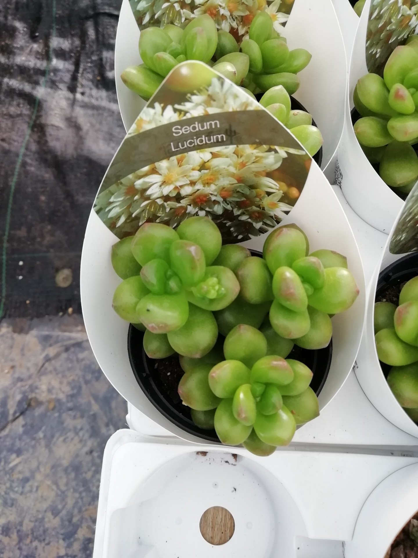 Vaso preto com suculenta Sedum Lucidum em embalagem branca com etiqueta triangular