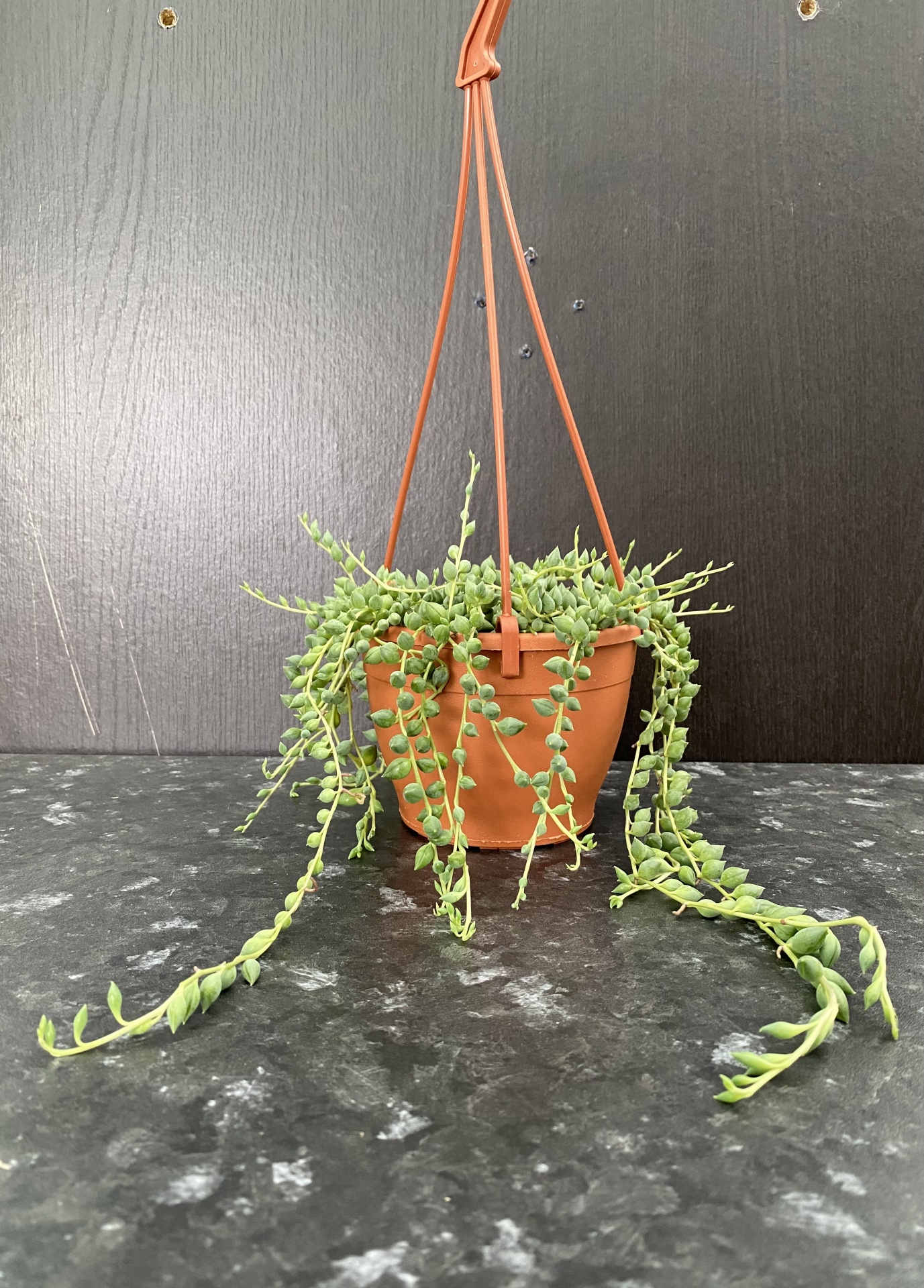 • Vaso suspenso de barro com planta pendente verde em fundo escuro