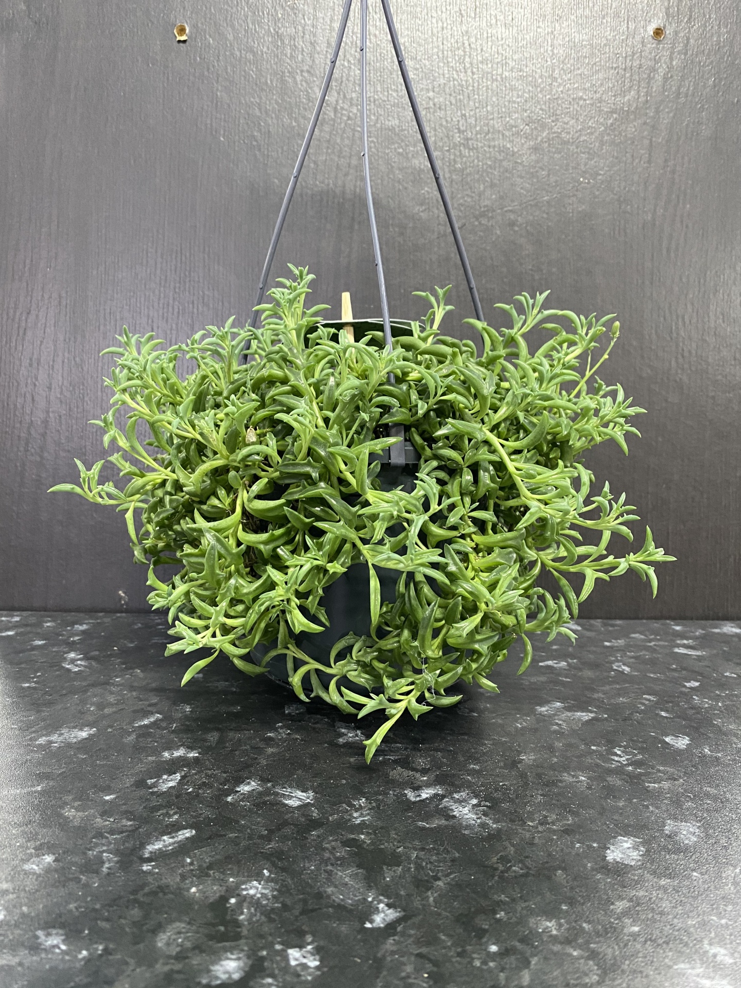 Planta pendente suculenta em vaso preto com suporte de pendurar