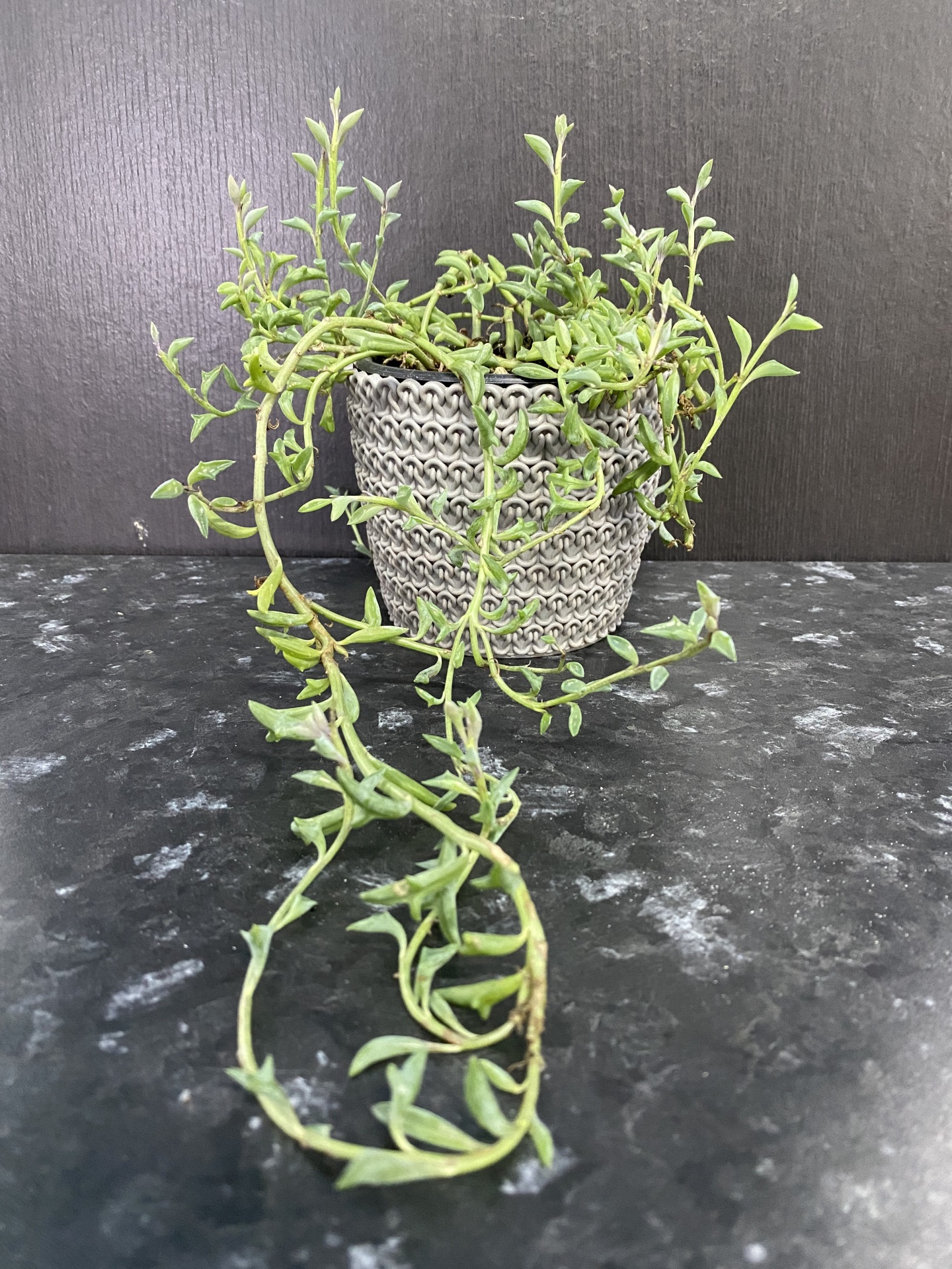• Planta suculenta verde em vaso cinzento sobre superfície e fundo escuros