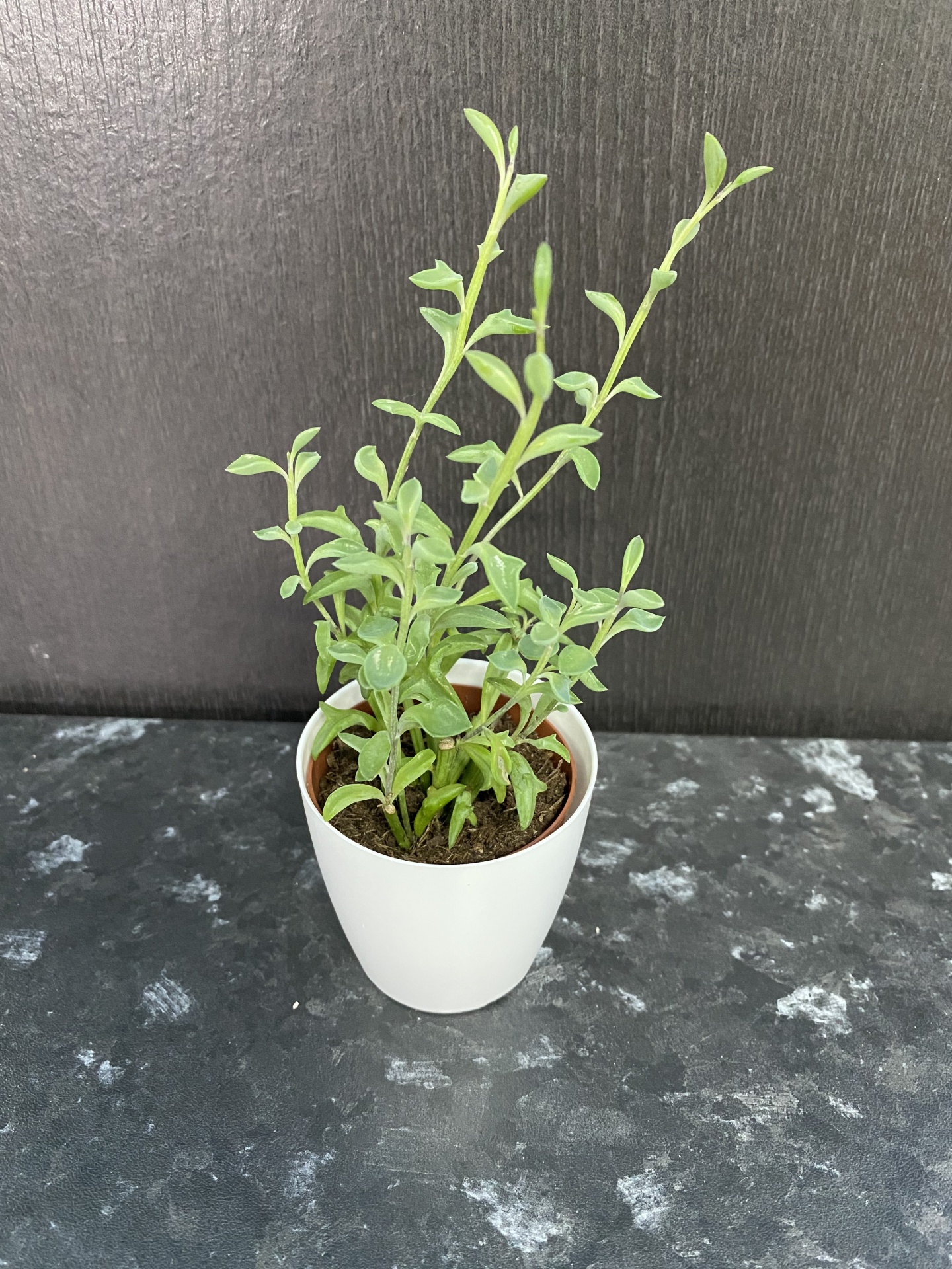 • Planta verde em vaso branco pequeno sobre superfície escura manchada