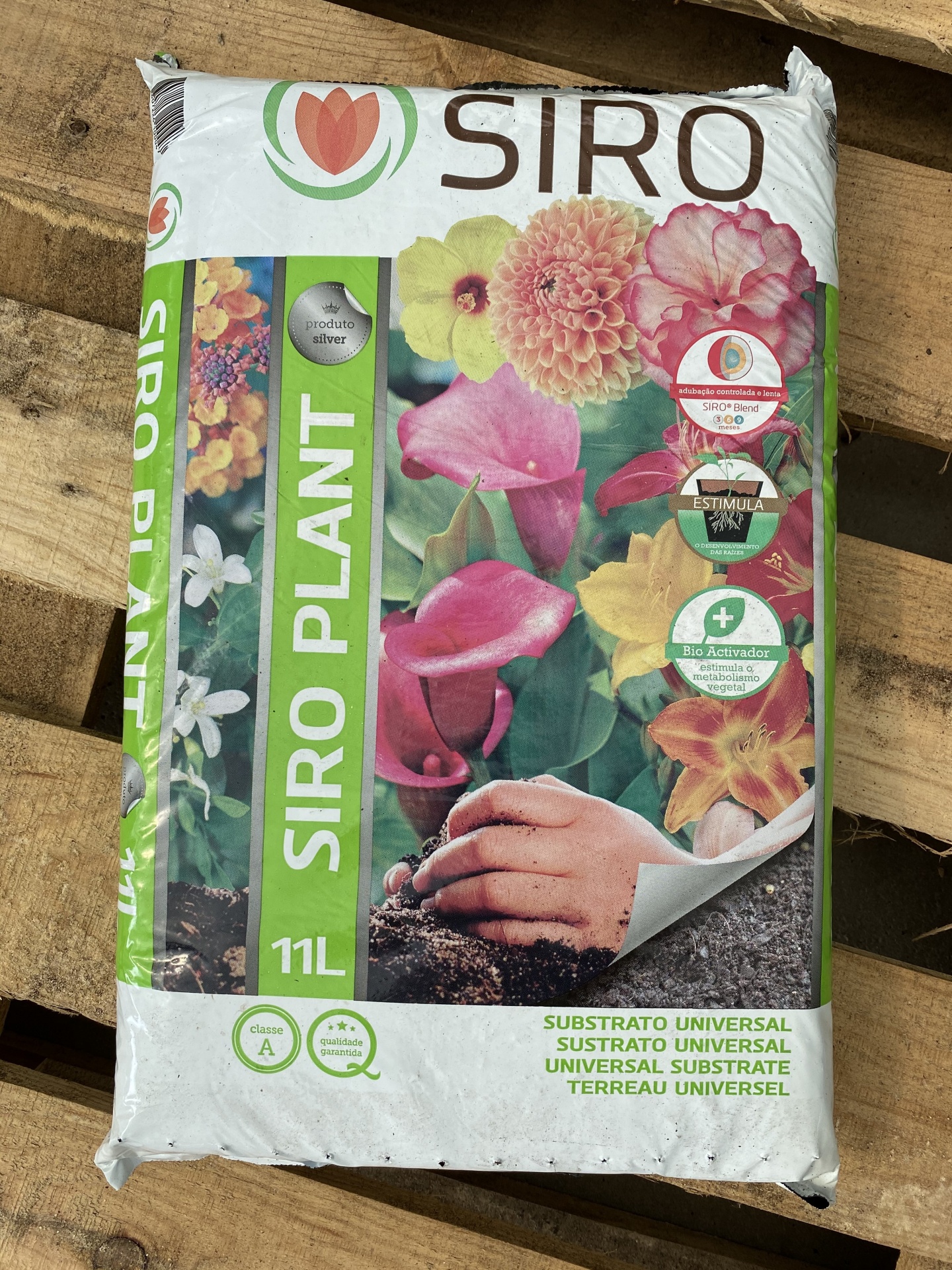 • Saco branco de substrato universal para plantas SIRO PLANT 11L com imagens de flores e mão a tocar o solo