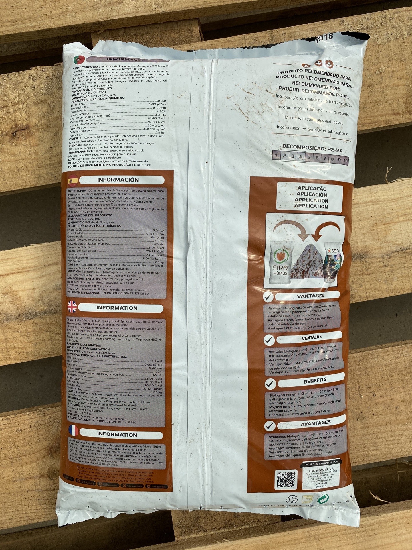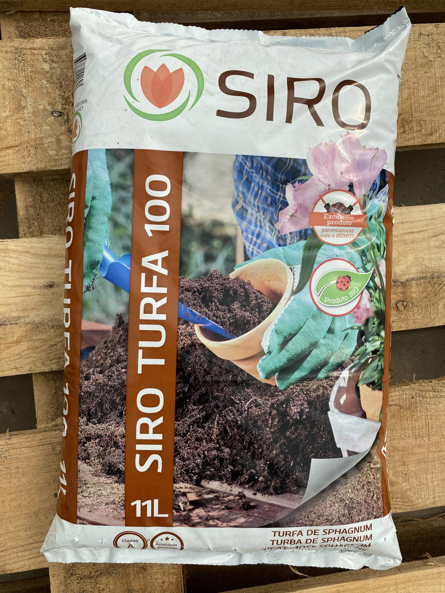 • Saco SIRO TURFA 100 com turfa para jardinagem, imagem de mãos a encher vaso com turfa.