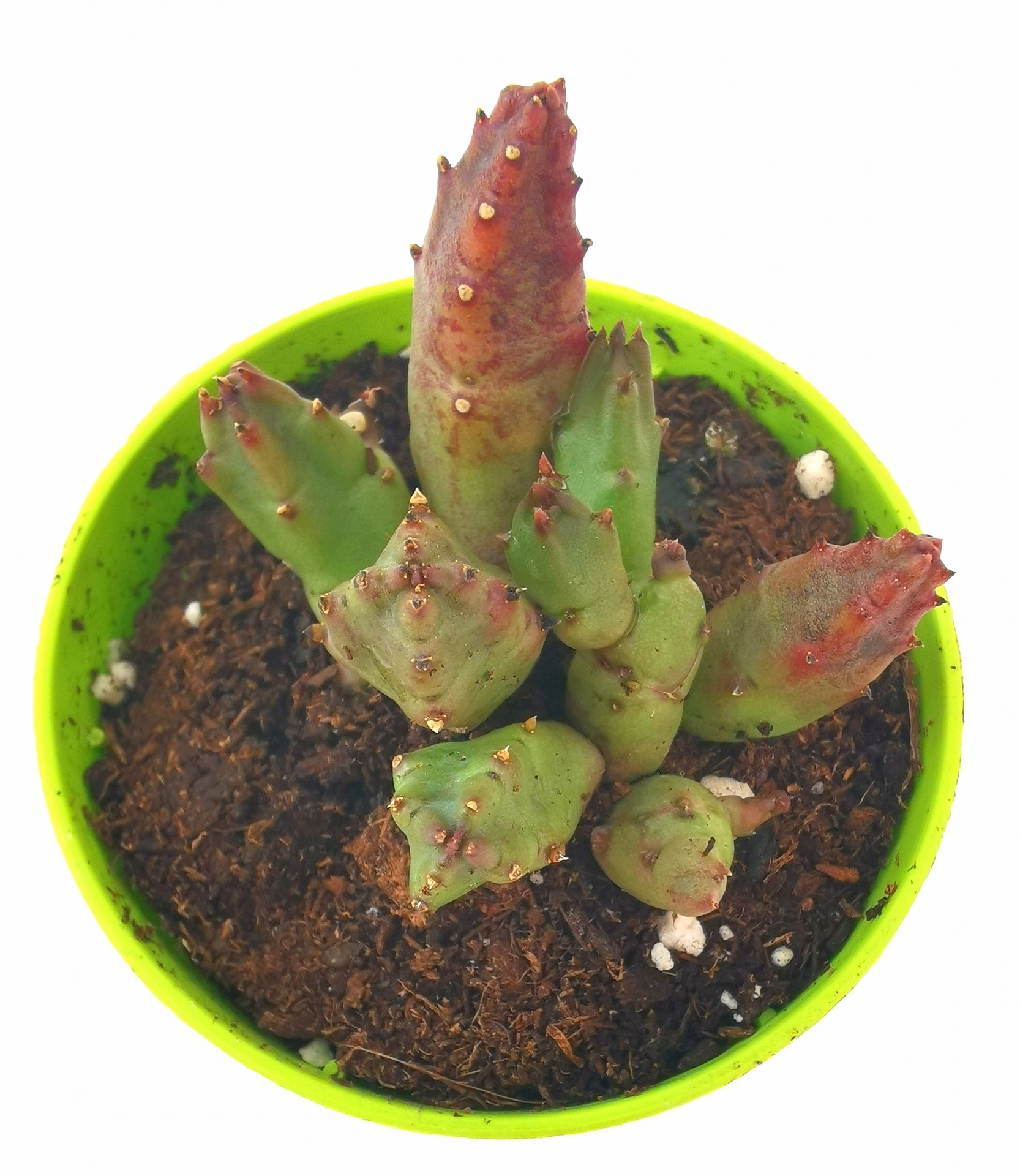 • Planta suculenta com caules verdes e vermelhos em vaso verde-limão