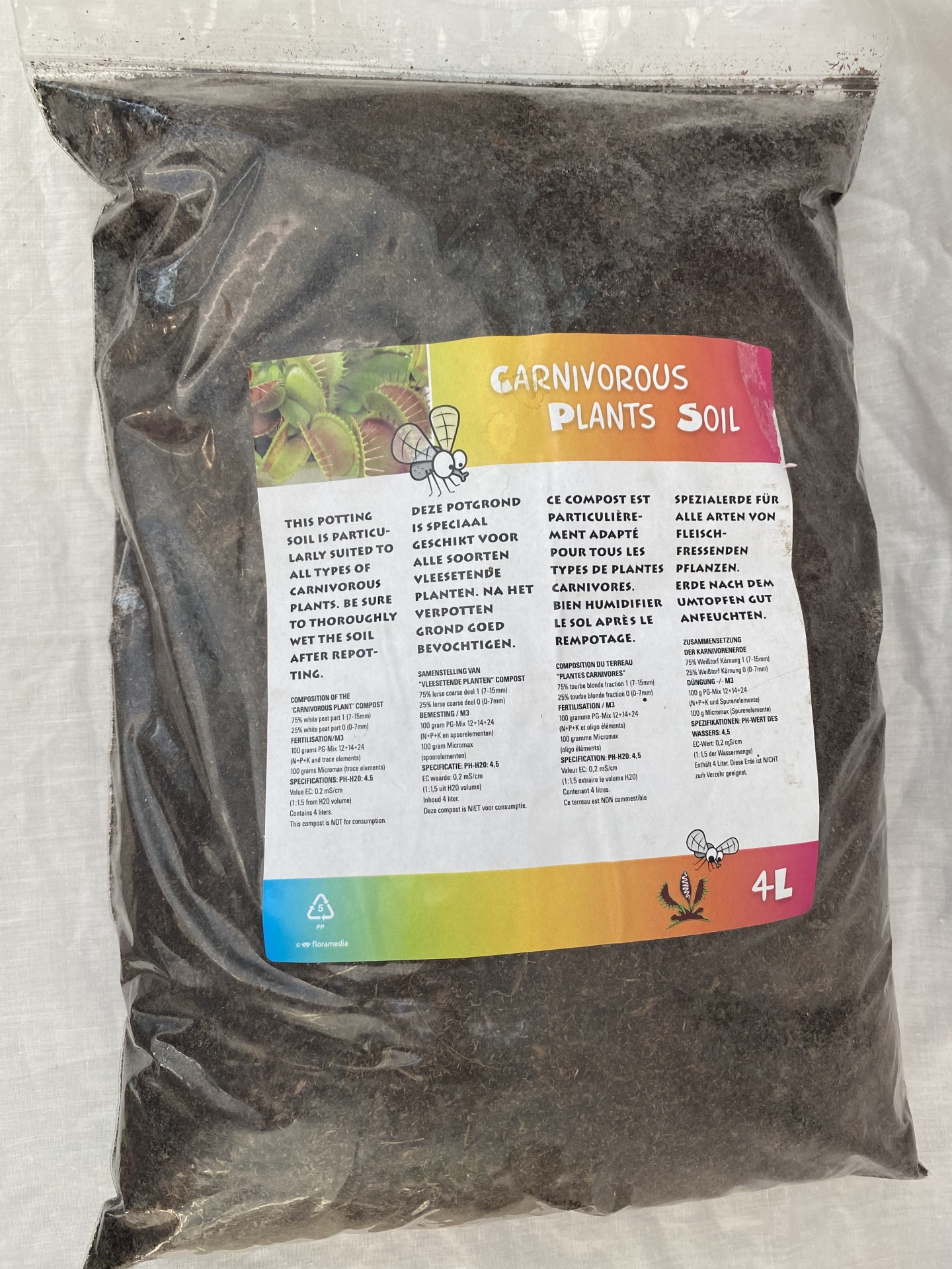 • Saco de solo para plantas carnívoras com etiqueta colorida e texto multilingue