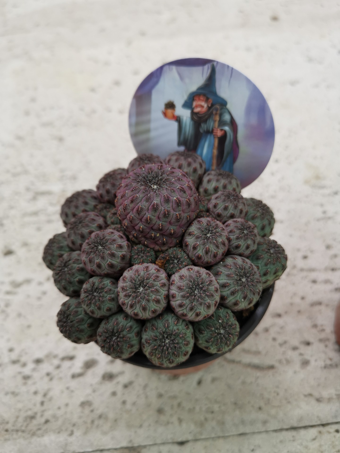 Cacto com várias pequenas esferas arroxeadas em vaso preto com etiqueta de feiticeiro.