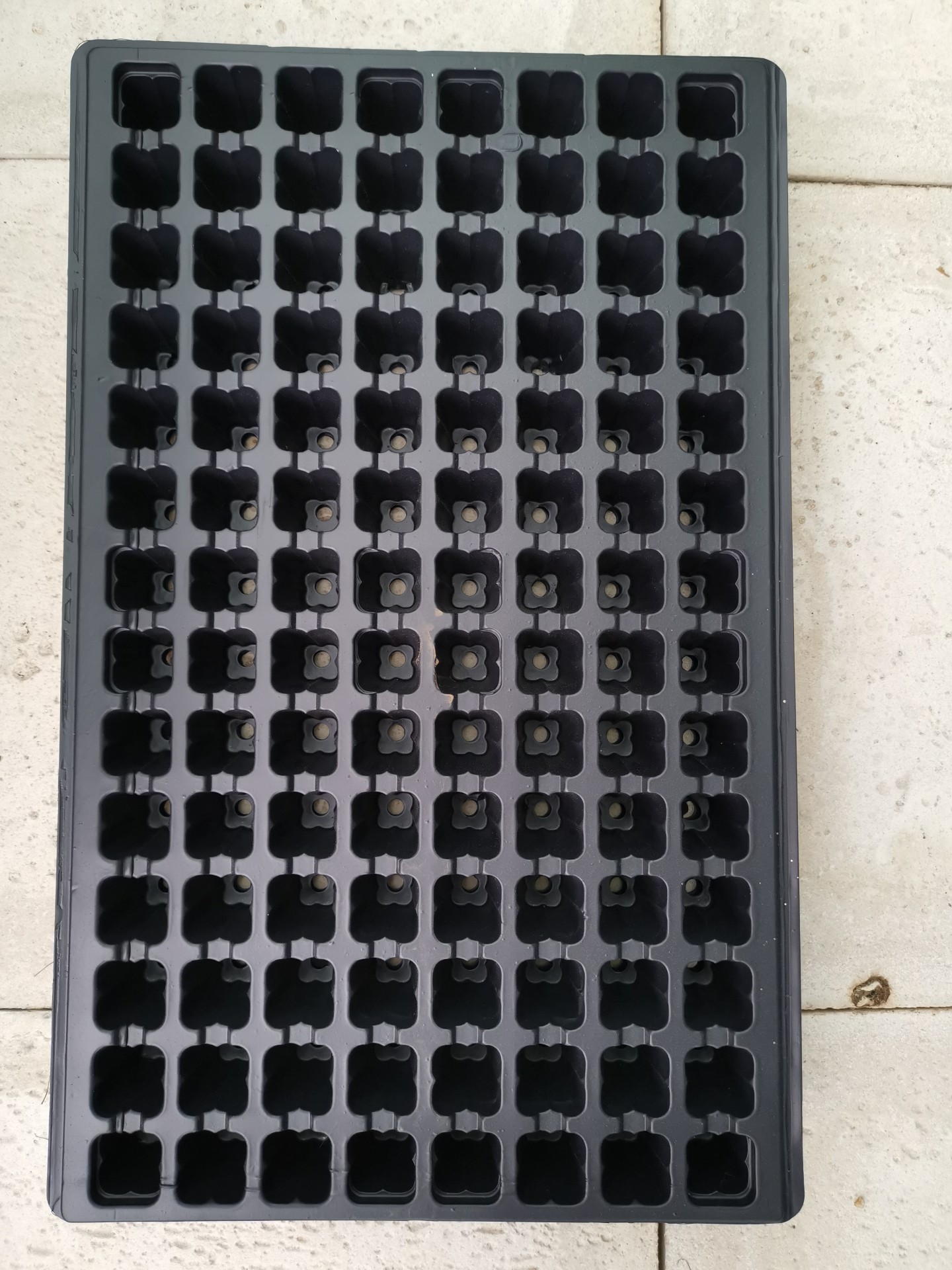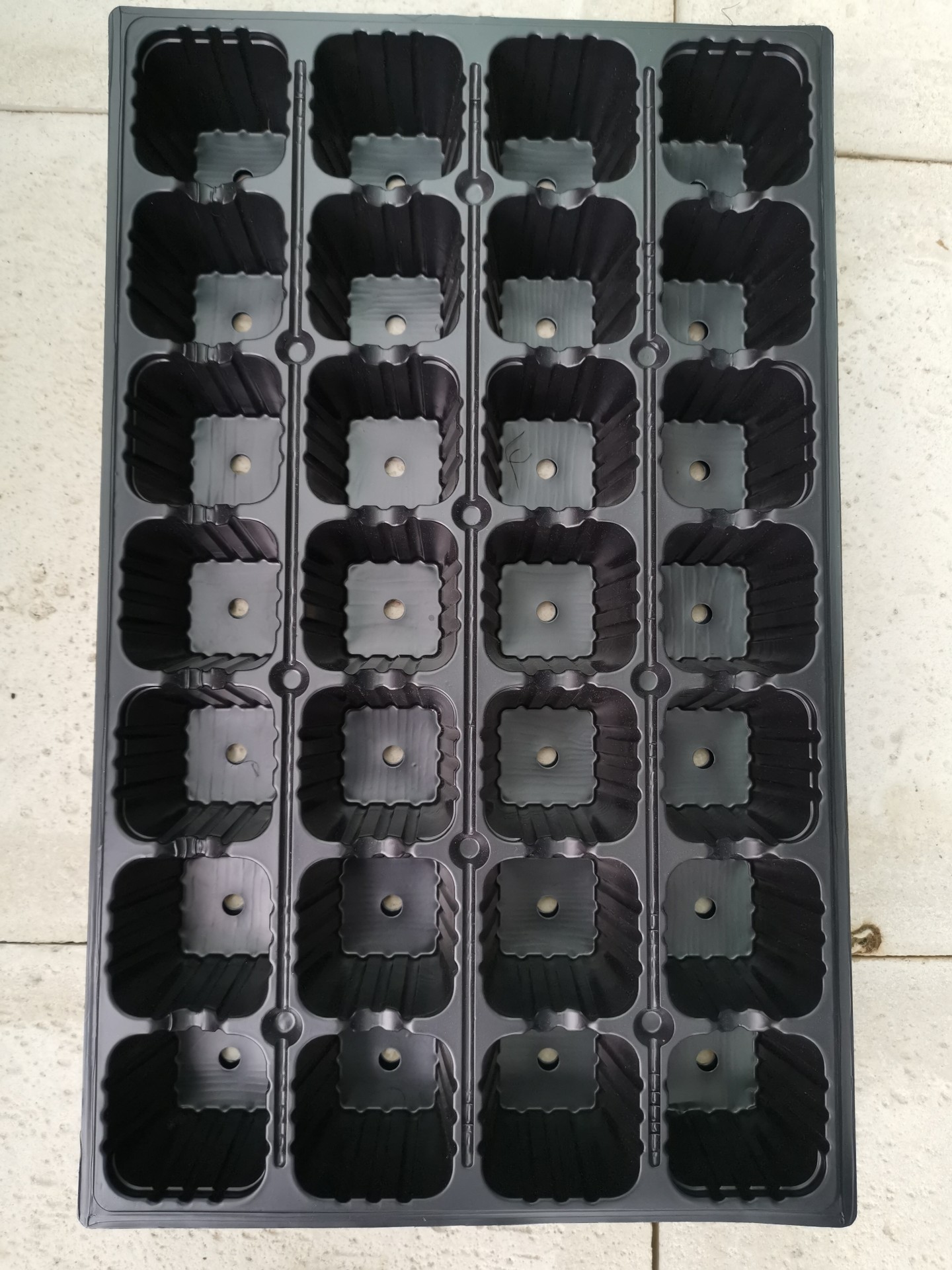 • Bandeja preta de plástico com múltiplas células quadradas e pequenos orifícios no centro
