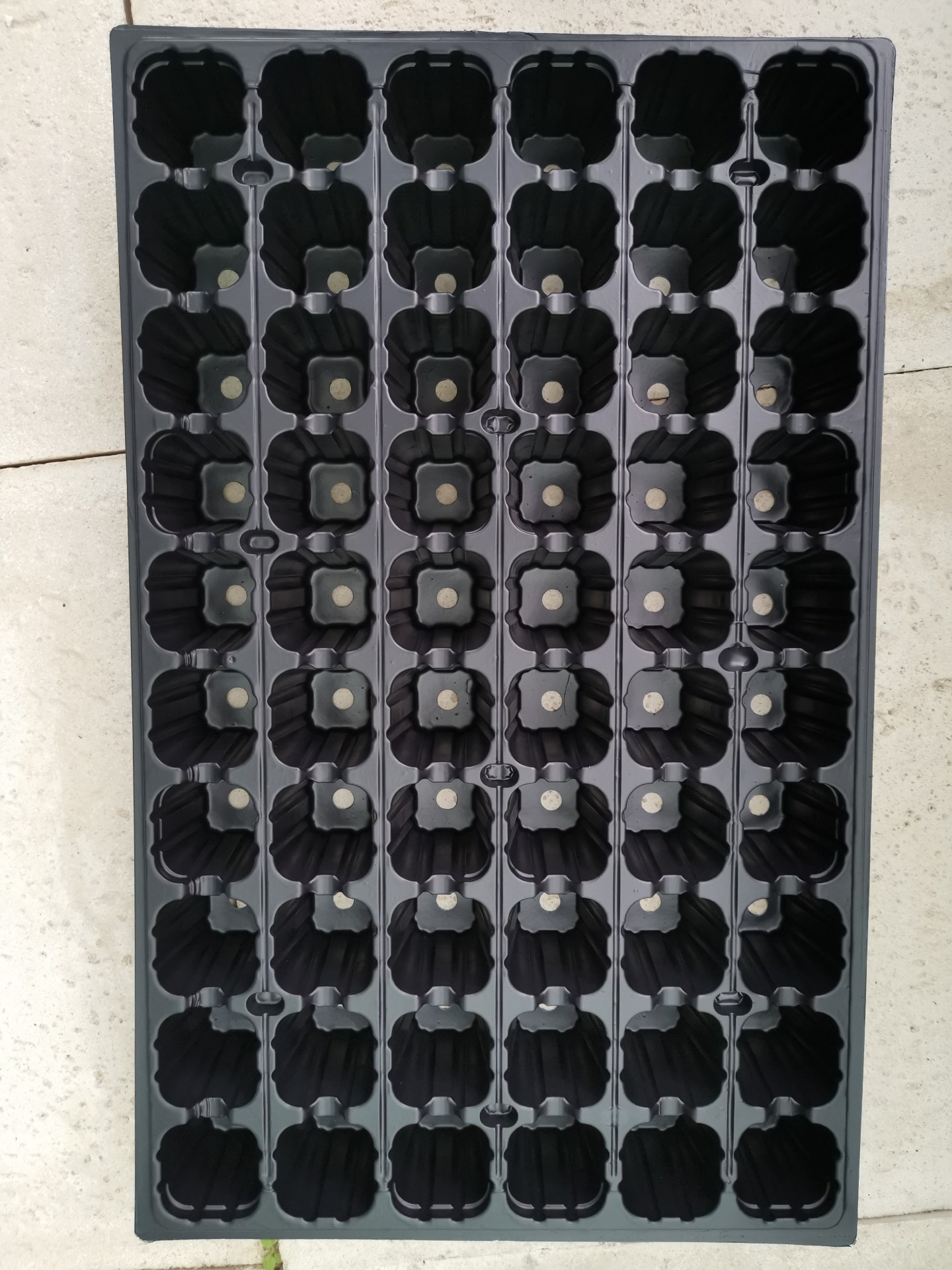 • Tabuleiro plástico preto com 48 compartimentos quadrados para plantação