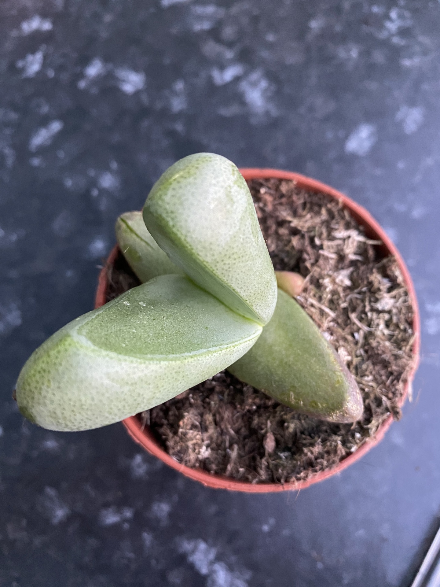 • Planta suculenta verde em vaso castanho sobre superfície escura marmorizada
