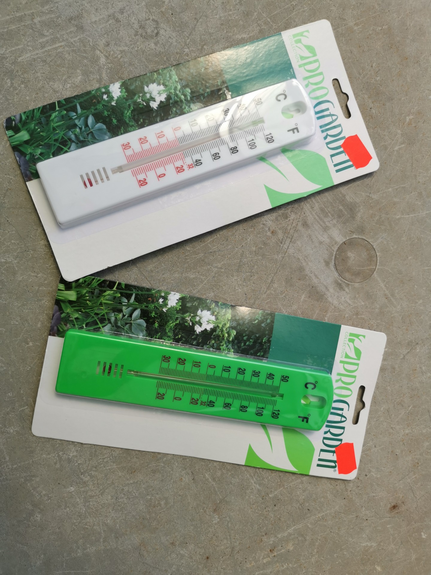• Termómetros branco e verde, embalados com imagem de plantas e texto 'PROGARDEN'