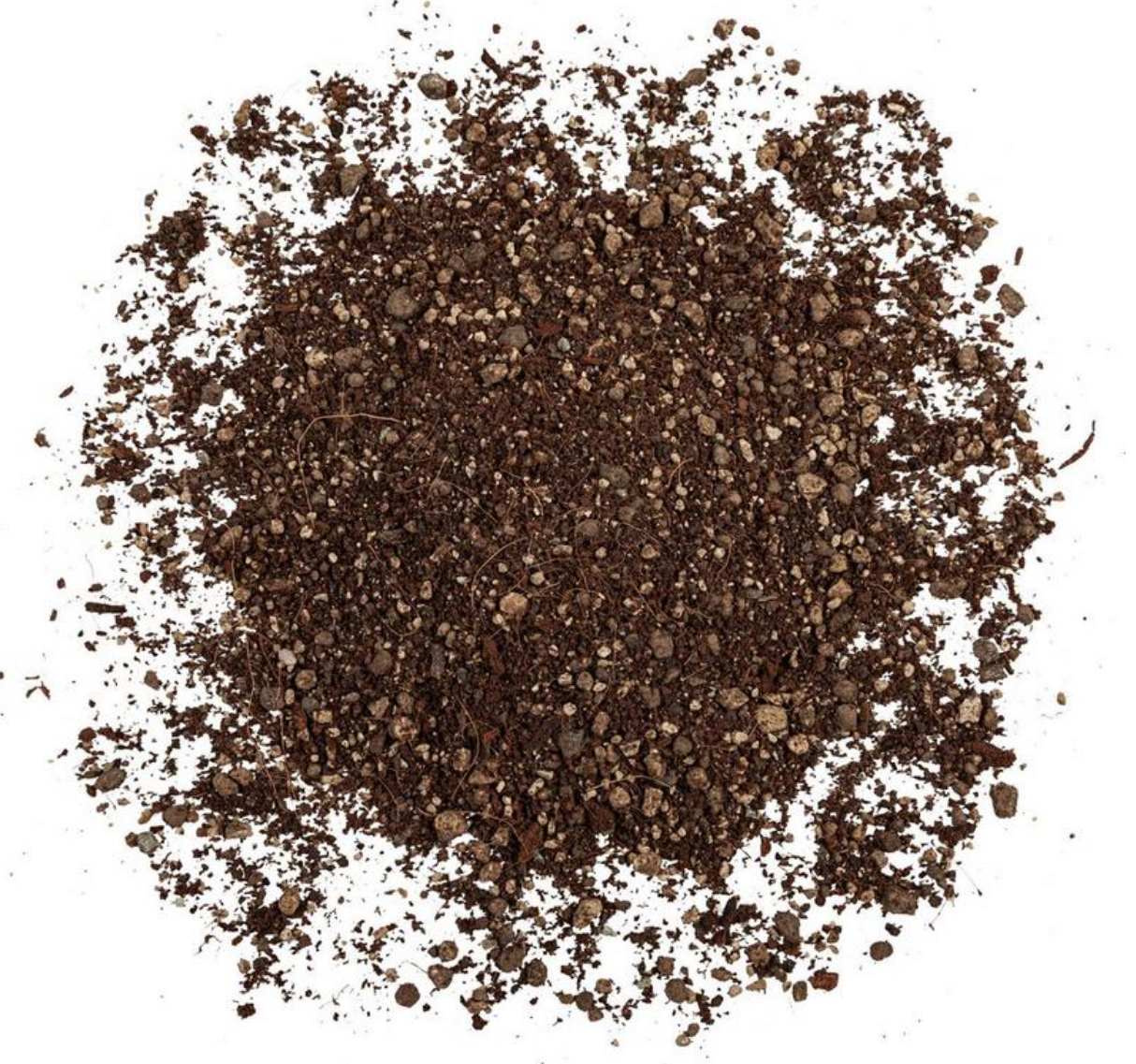 • Montículo de terra castanha escura com partículas visíveis em fundo branco