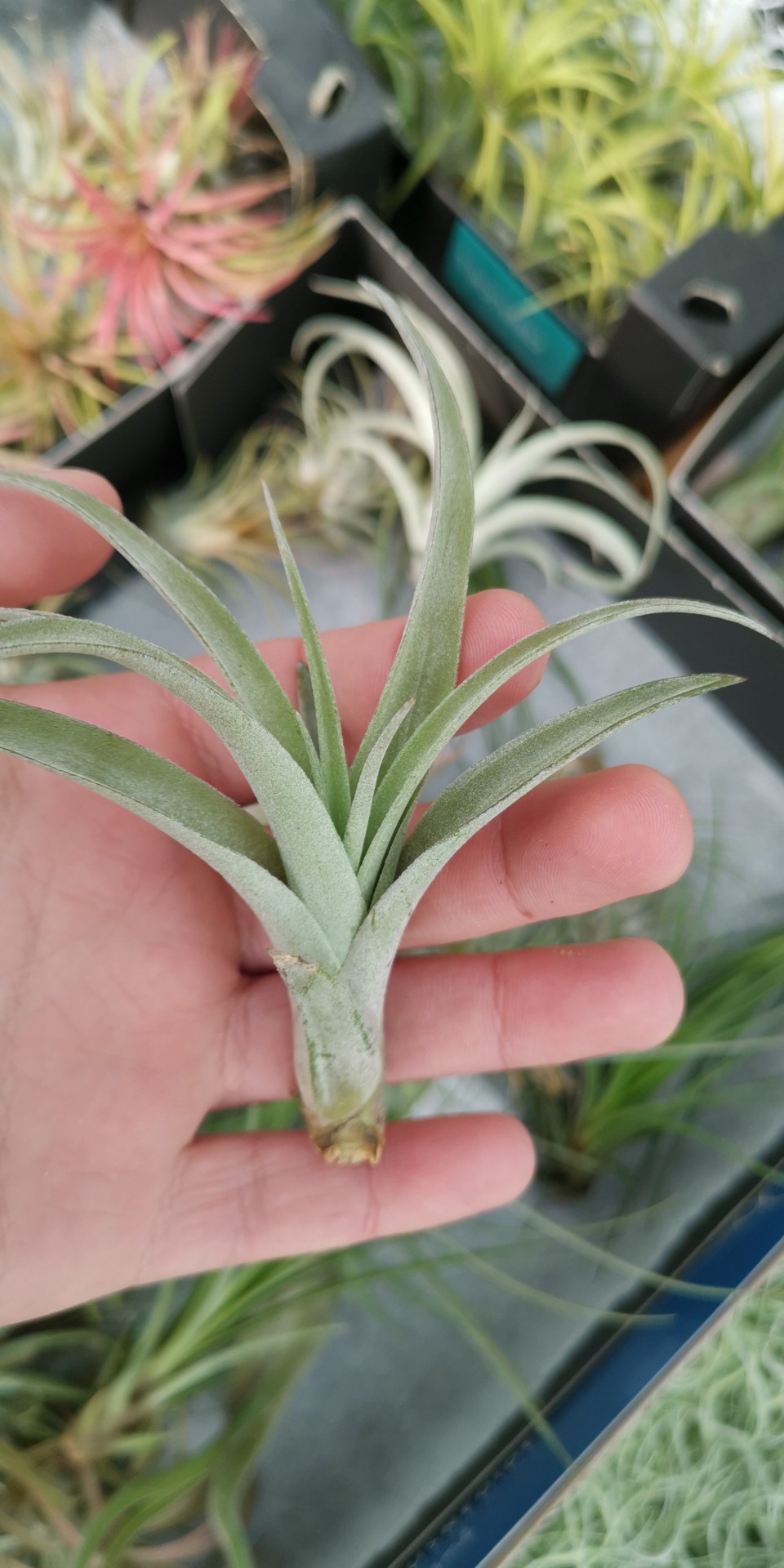 Planta Tillandsia verde com textura aveludada na mão de uma pessoa, com outras plantas ao fundo