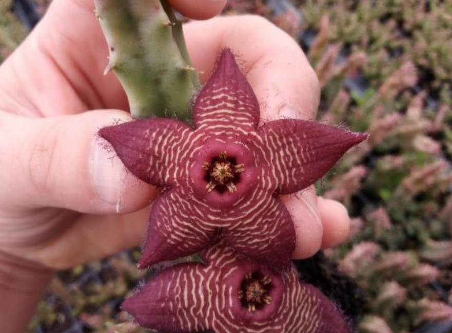 Flor de cactus roxa com riscas brancas segurada por uma mão sobre fundo de plantas.
