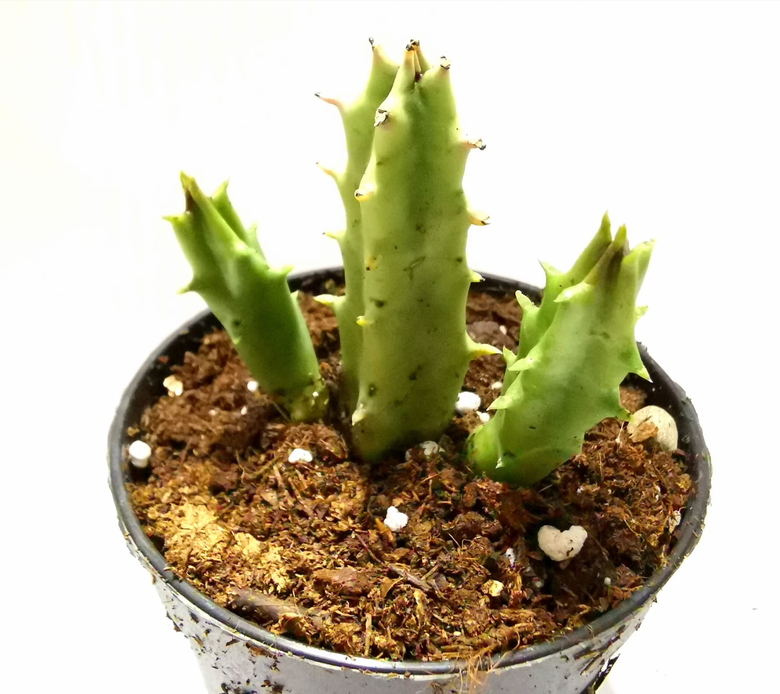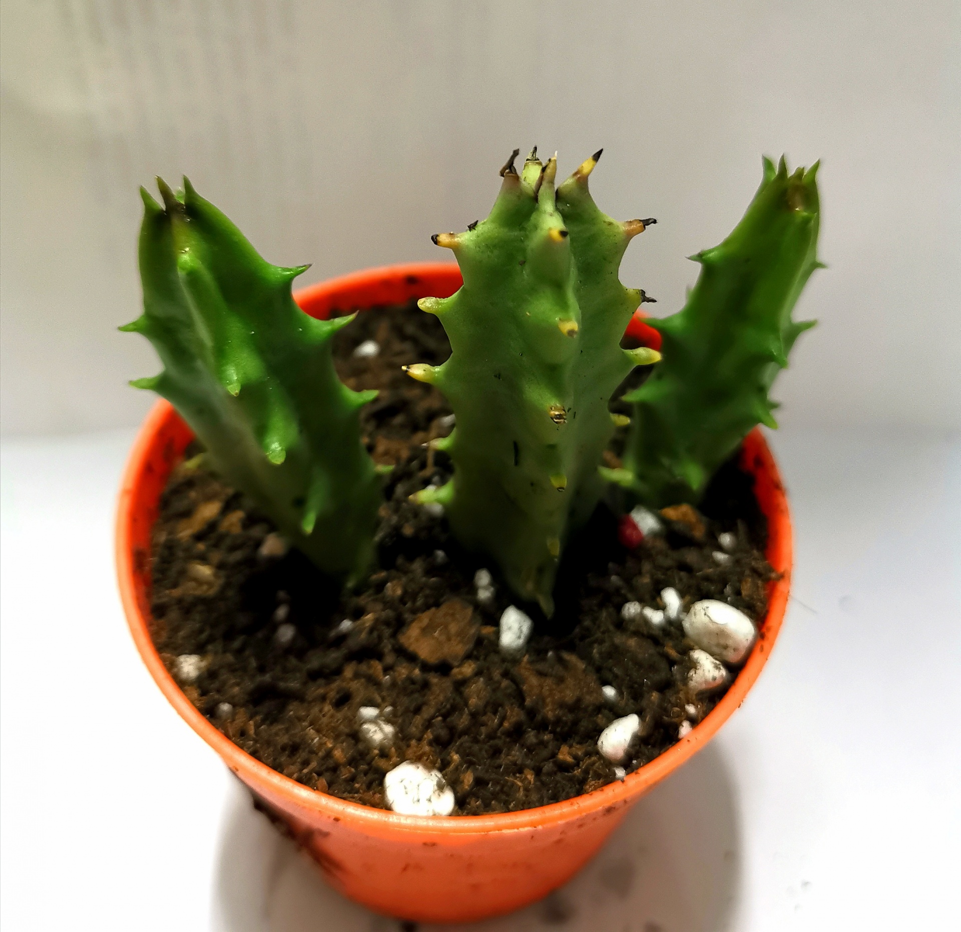 • Vaso preto com três brotos de cacto verde claro em terra castanha.