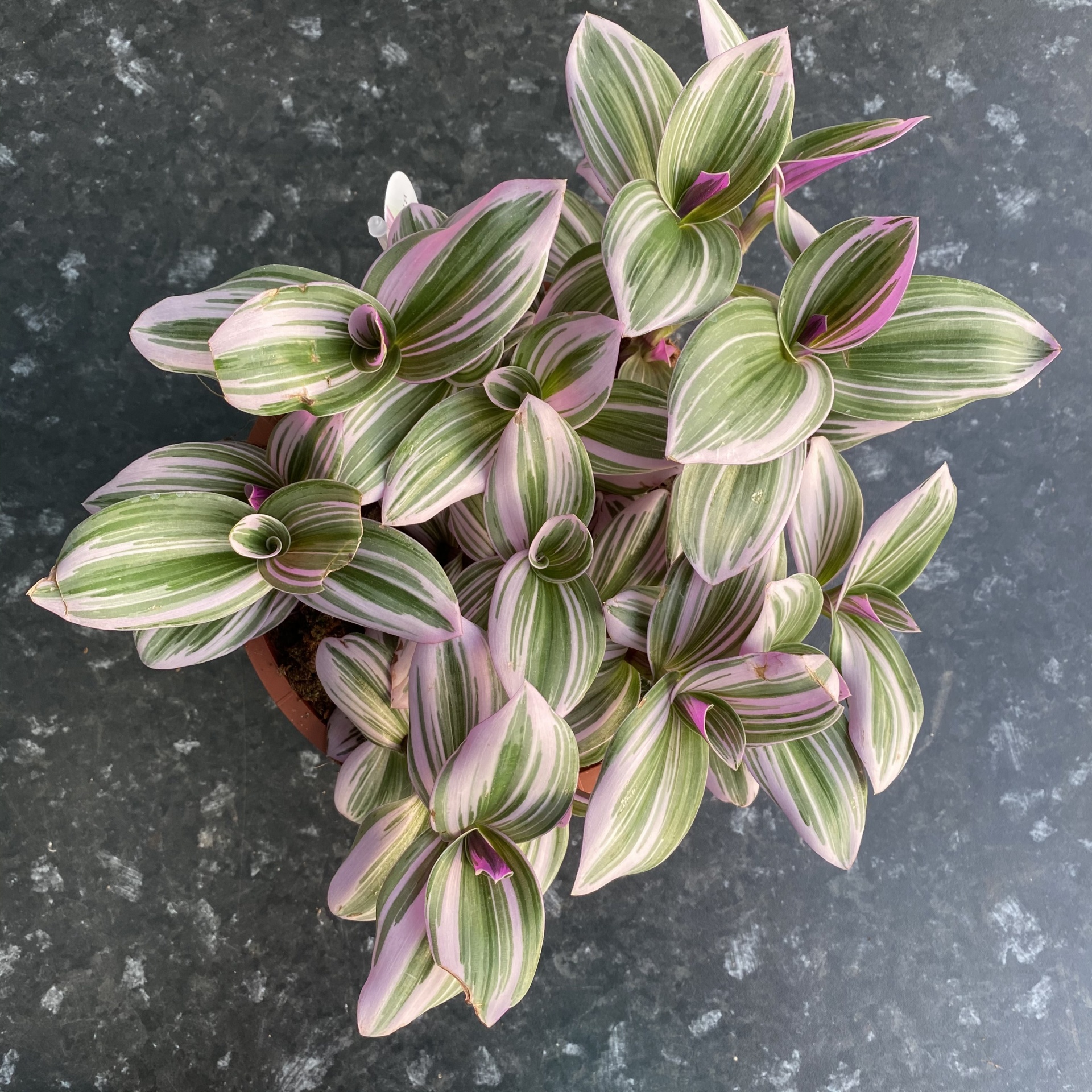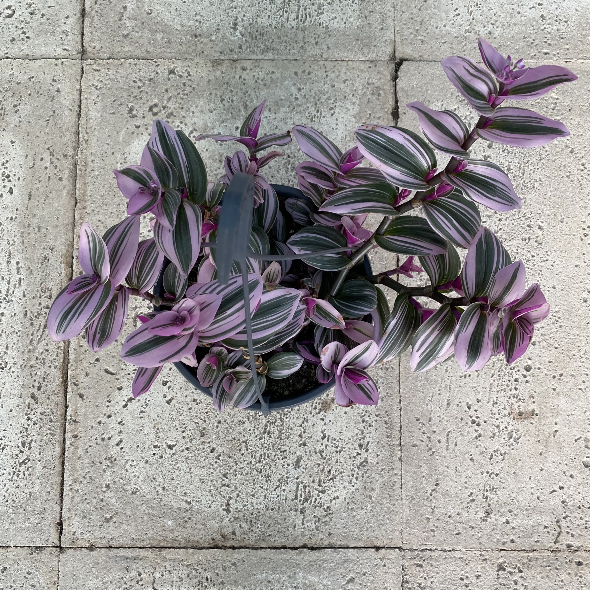 • Planta Tradescantia zebrina com folhas roxas, verdes e brancas em vaso preto em chão de betão.