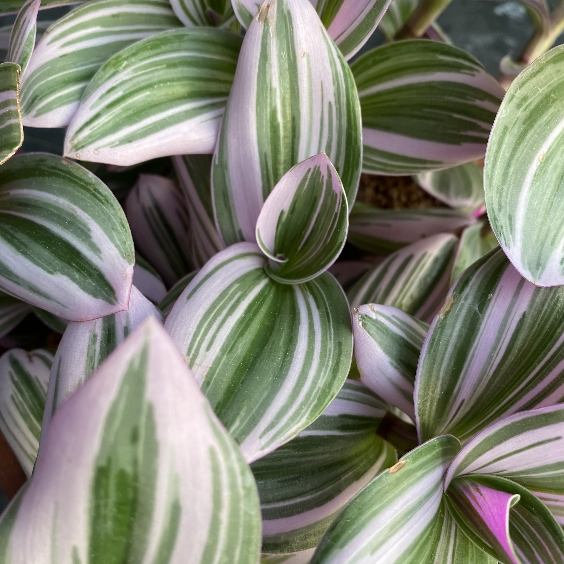 • Folhas verdes, brancas e rosa claro de planta Tradescantia zebrina com padrão riscado.