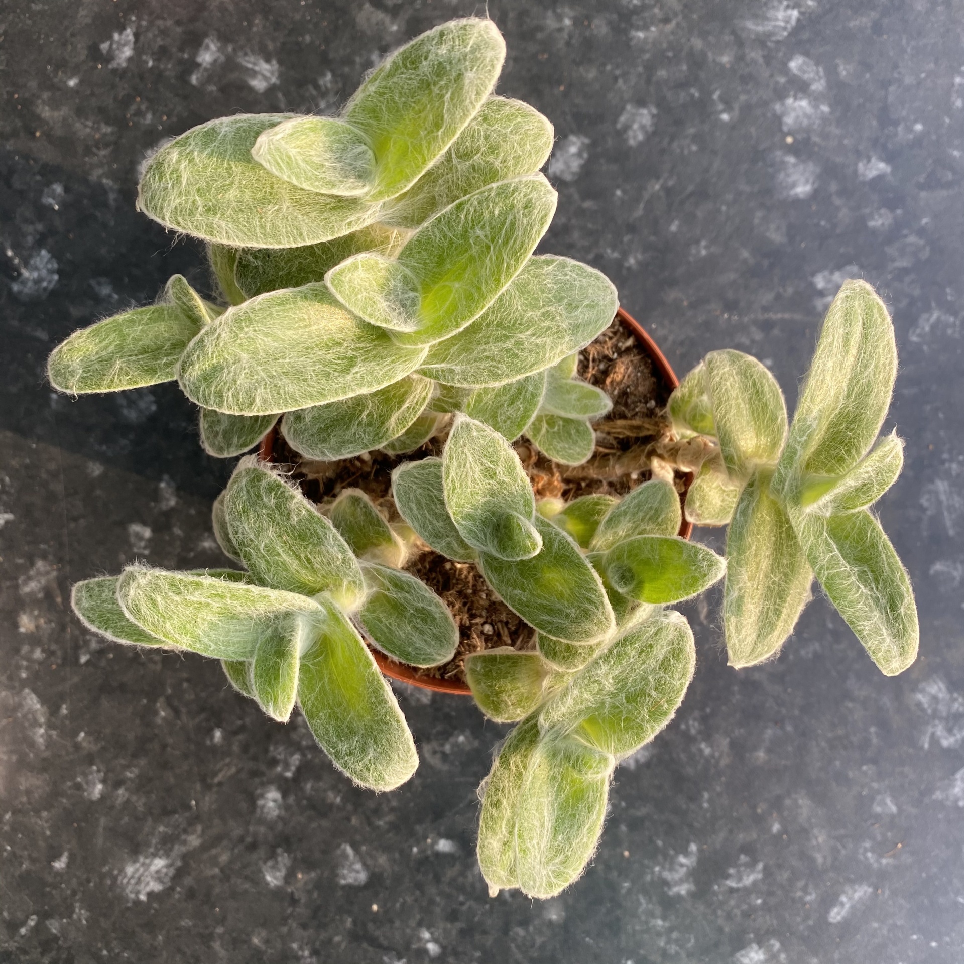 • Planta suculenta verde com folhas peludas em vaso castanho sobre pedra escura