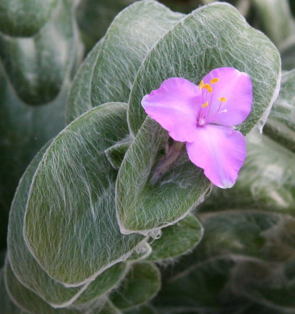 • Planta com folhas verdes aveludadas e flor roxa com estames amarelos